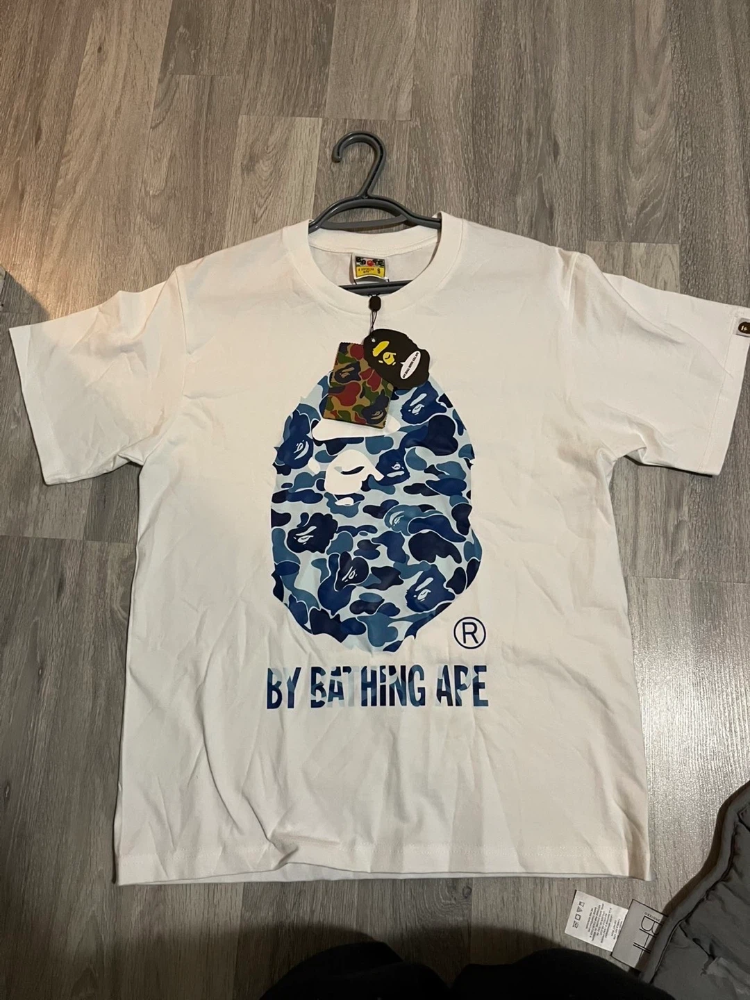 A Bathing Ape tee in size small! The shirt is white with a blue camo BAPE head design. It's in great condition and ready for a new home! Perfect for any BAPE fan