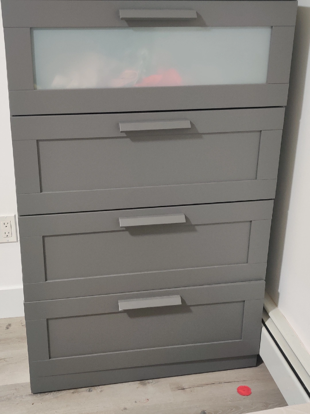 Selling a grey IKEA Hemnes chest of 4 drawers. It's in great condition and perfect for adding storage to any room. The top drawer has a frosted glass front, adding a nice design detail. This dresser is sturdy and reliable, ready to help organize your space