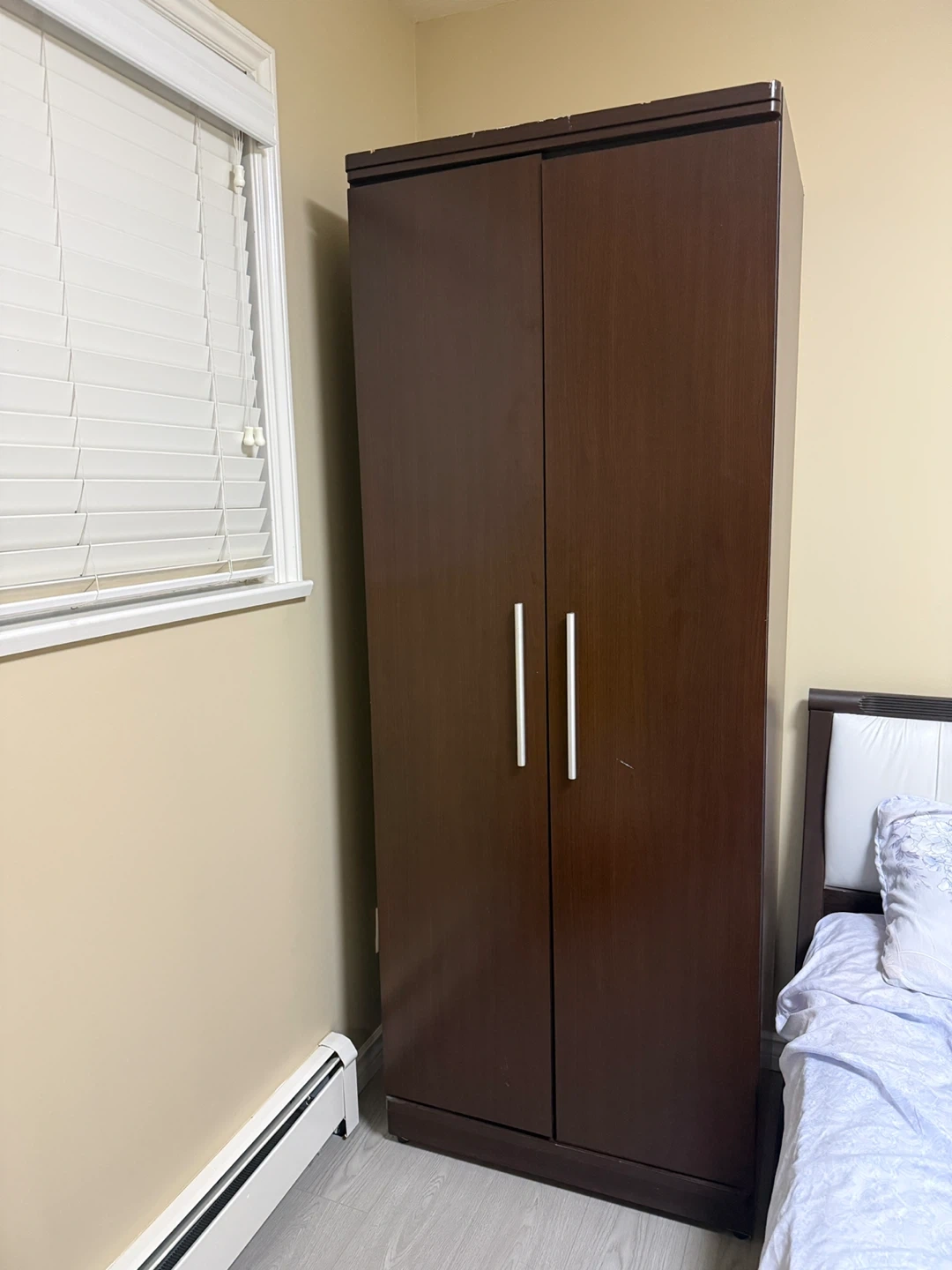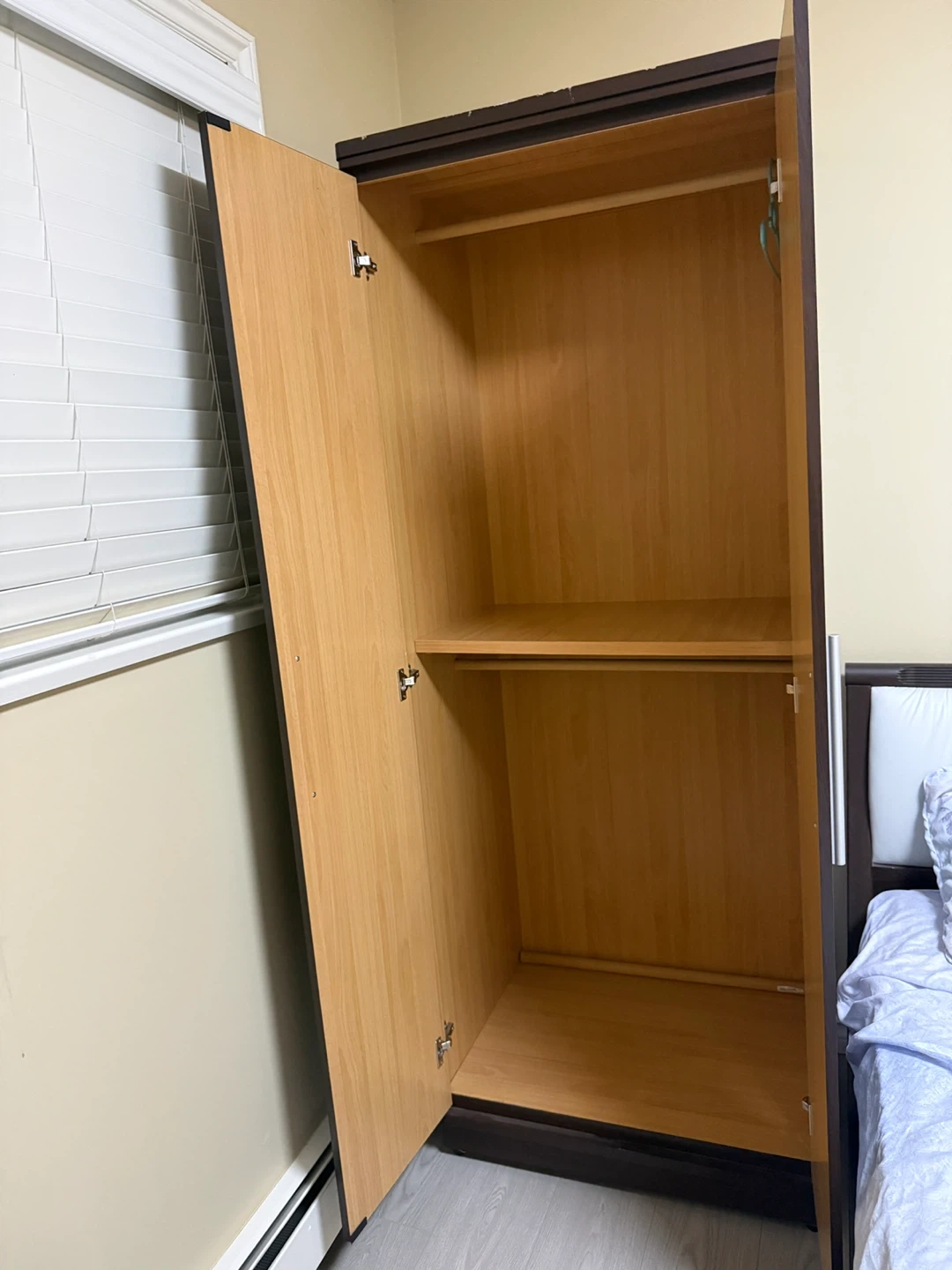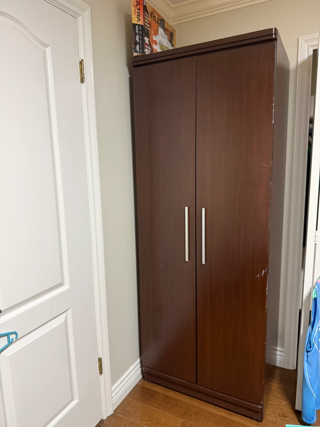 Selling two brown wooden wardrobe. It has two doors and includes shelves and a hanging rod inside. It's in good condition and ready for a new home!