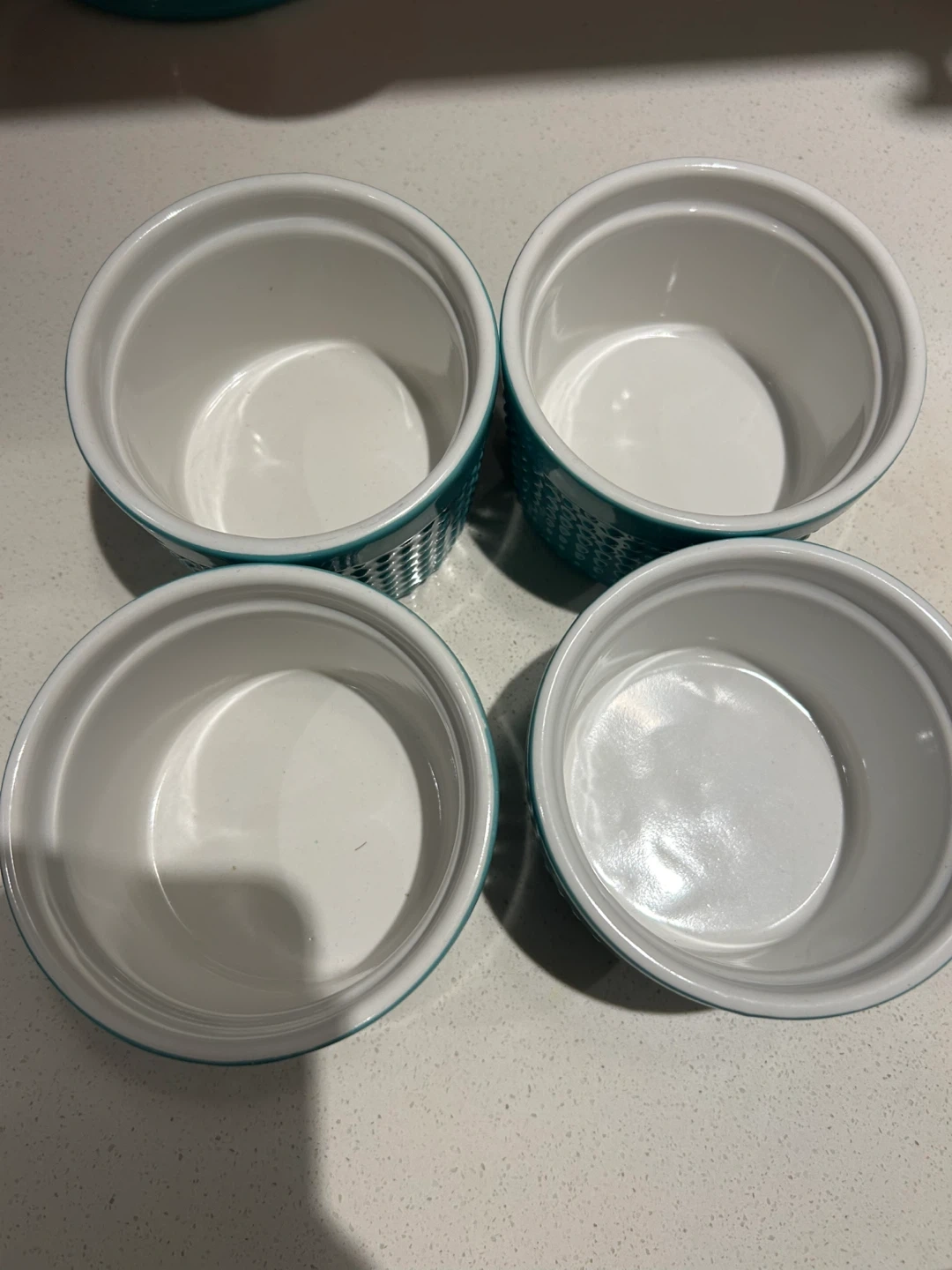 10Selling a set of four teal ramekins from NOW Designs! They are in great condition and ready for your next baking project. They are dishwasher and microwave safe, making them super convenient to use and clean. Perfect for individual desserts or side dishes