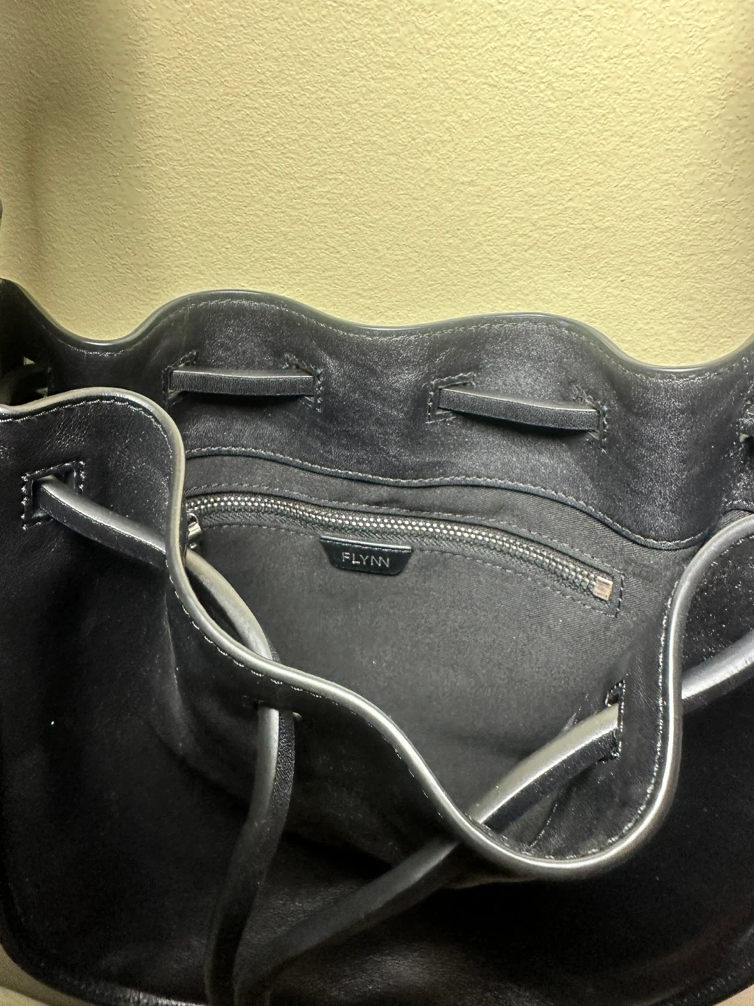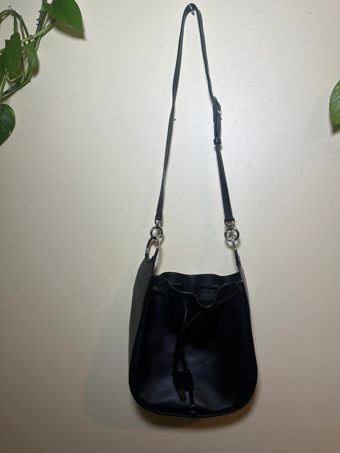 Selling a stylish Flynn black leather bucket bag! It's in great condition and ready for a new home. The bag features a drawstring closure and a long strap for easy carrying. Perfect for everyday use!