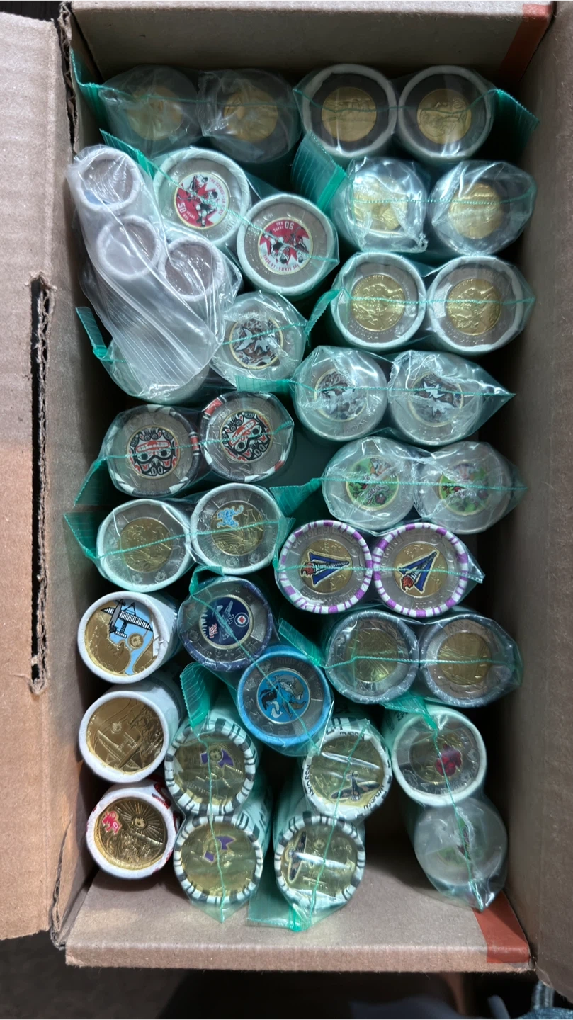 62For Tonnie :- RCM roll is 75 Bank roll is 70 For lonnie :- RCM roll is 48 Bank roll is 42 I have a box full of rolls of Canadian two-dollar coins, also known as toonies! They're all sealed in their original packaging and ready for a new home. Perfect for collectors or anyone who needs a lot of change!
