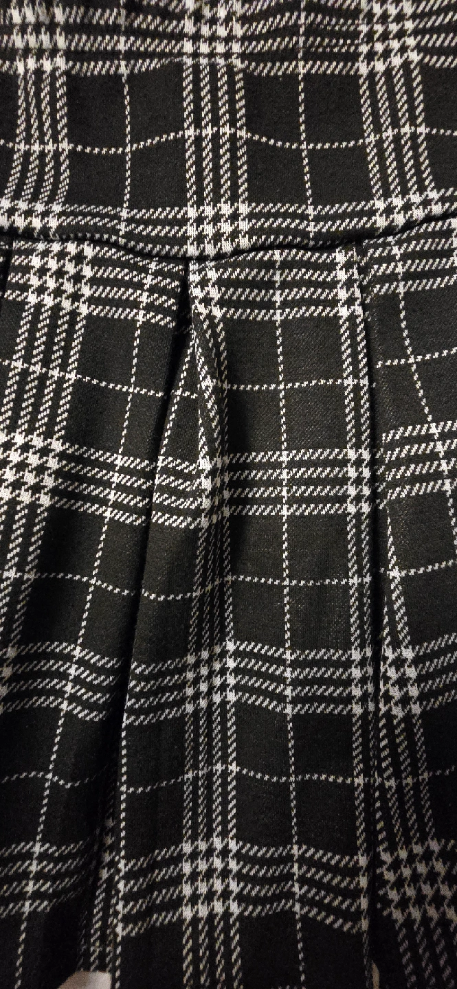 This is a cute black and white plaid mini skirt! The waist measures about 28 inches, and the length is about 15 inches.