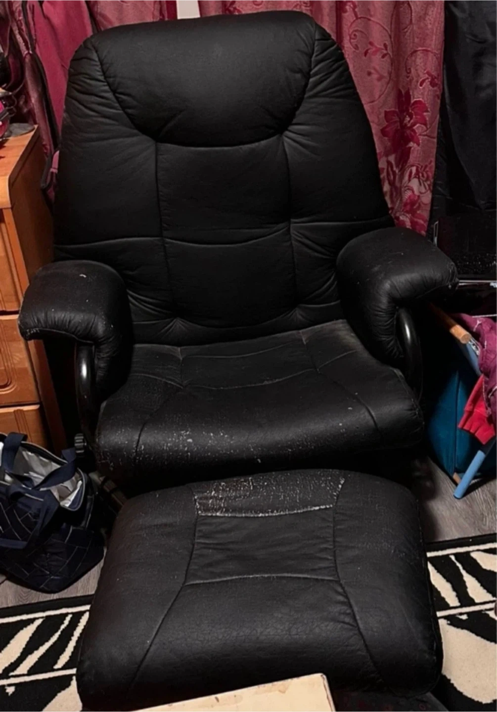 Selling a black leather office chair that comes with a matching ottoman. It's showing some signs of wear and tear, as you can see in the pictures, but it's still a comfy place to sit while you work or relax!