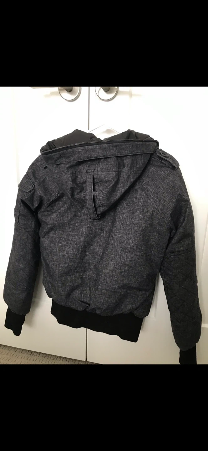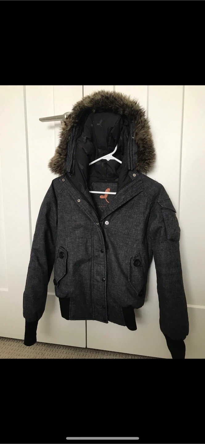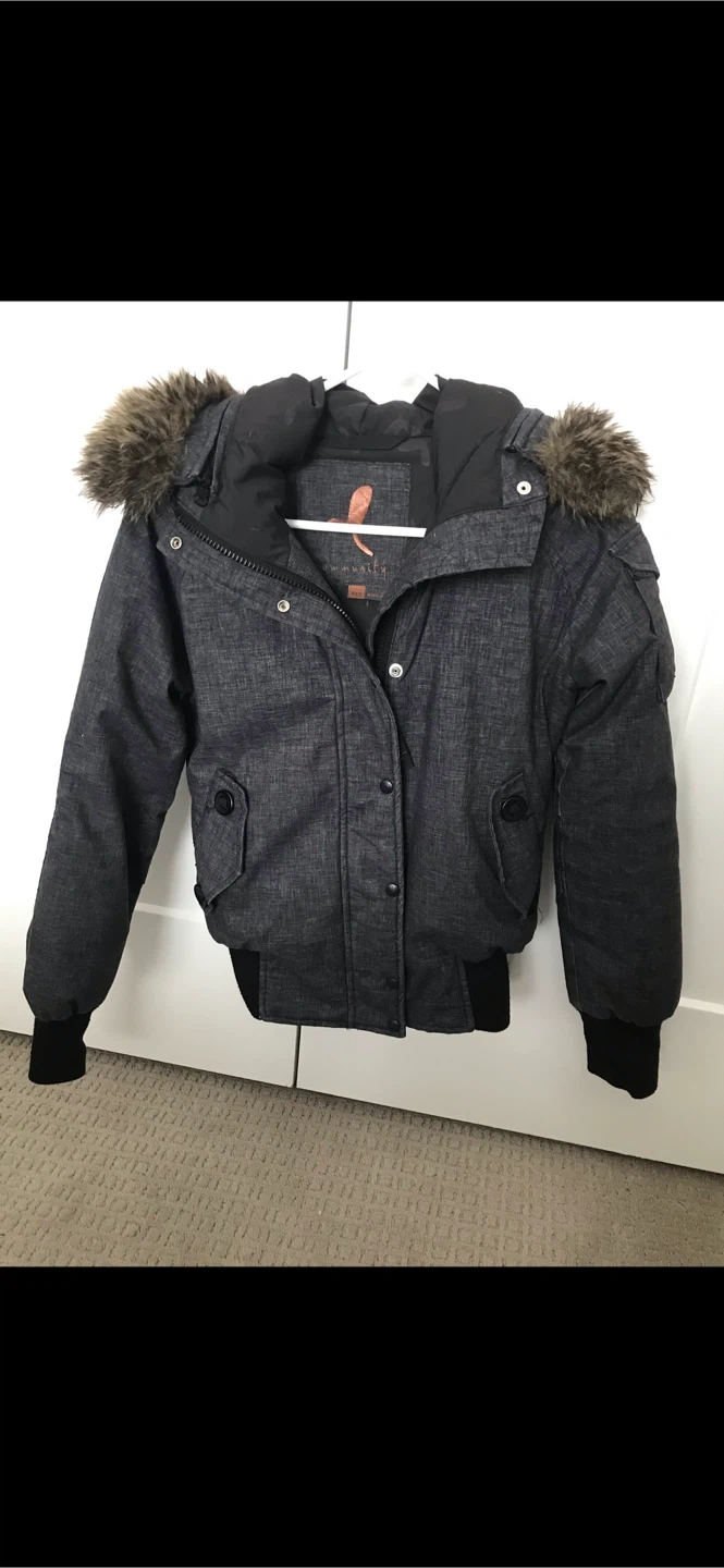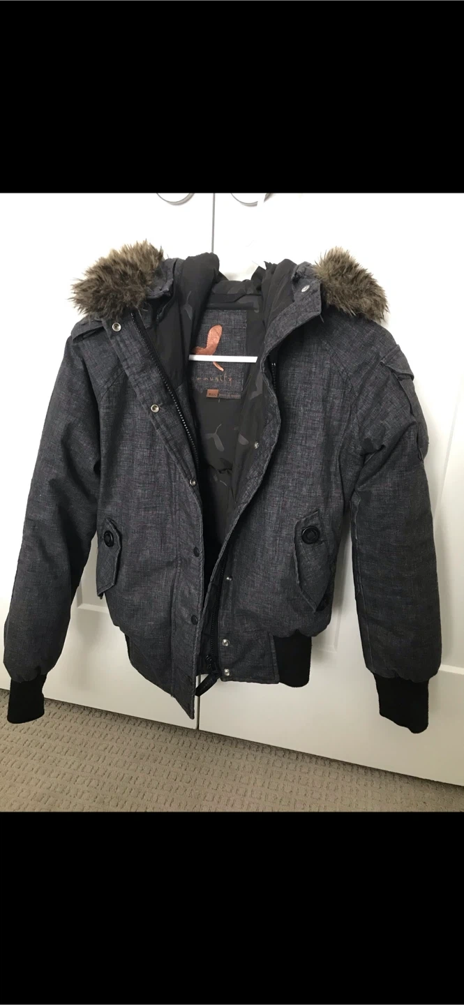 Selling a gently used TNA winter jacket in a stylish grey colour. It features a cozy fur hood, perfect for those chilly Canadian days. This jacket is in great condition and ready for a new home!