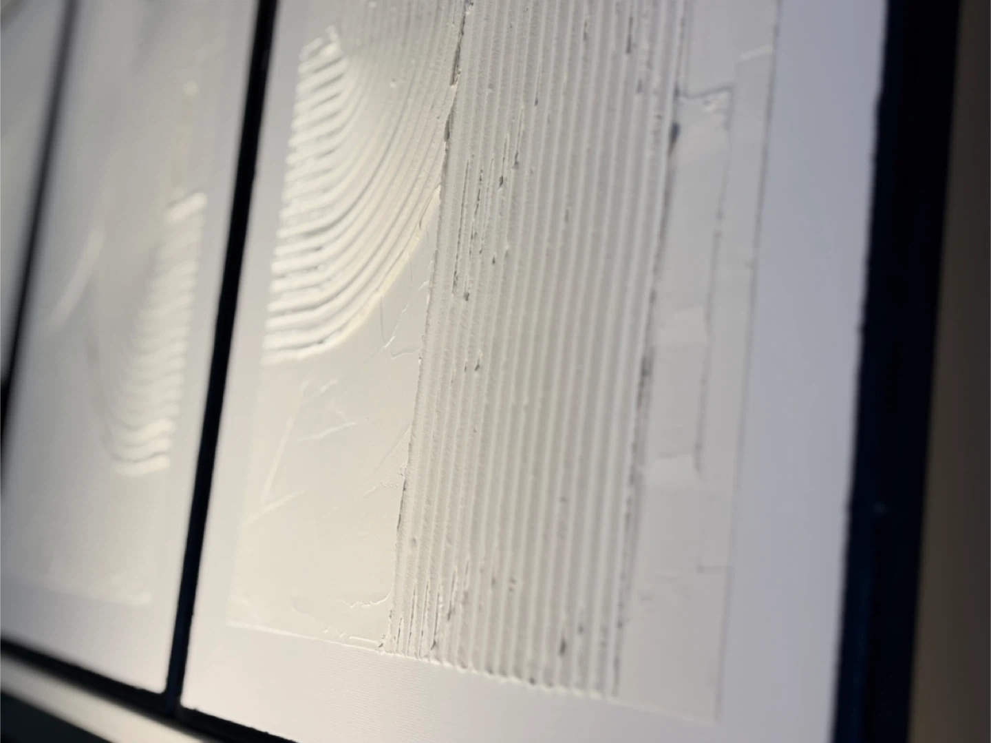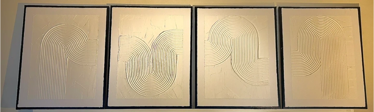10Selling a set of four textured abstract art pieces. They are in great condition and would add a unique touch to any room! The texture is quite interesting and the simple design is very modern. Smoke free and pet free home MEASUREMENTS: 16 inches by 20 inches