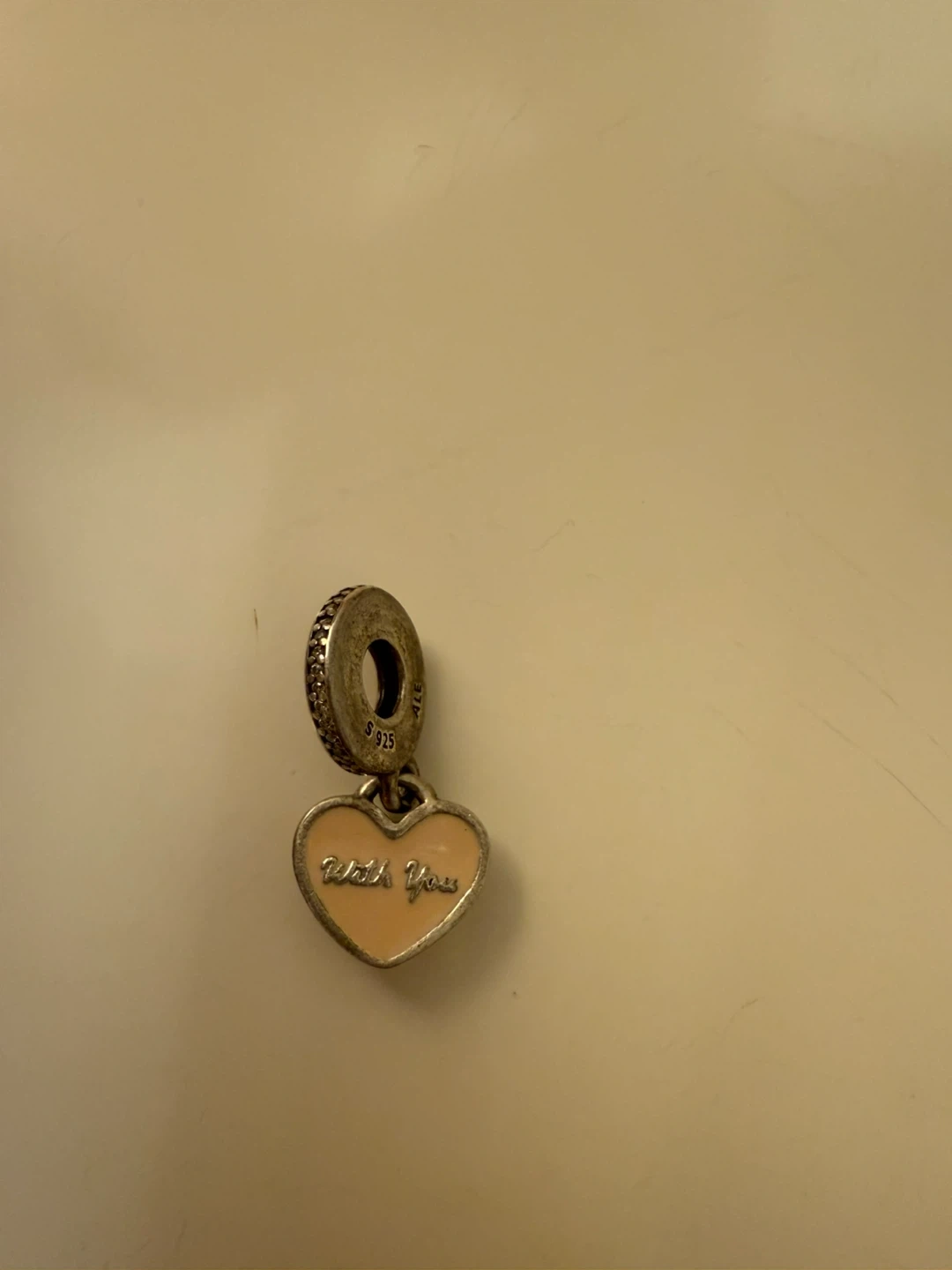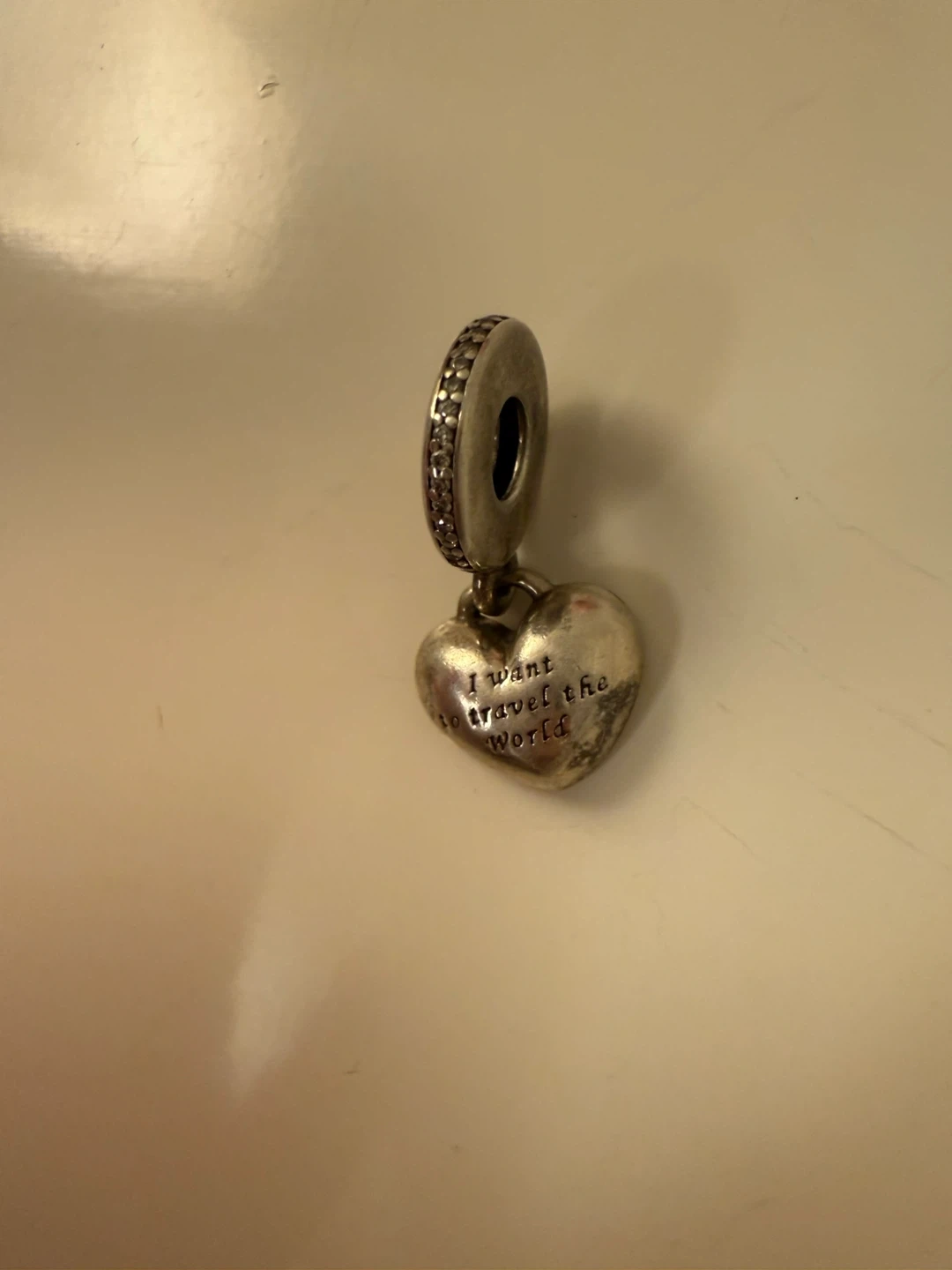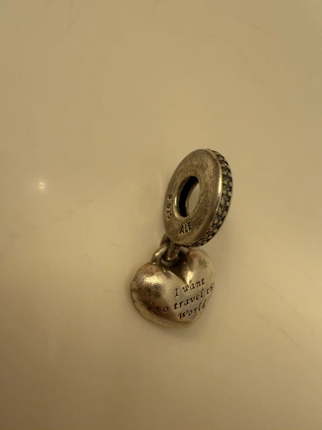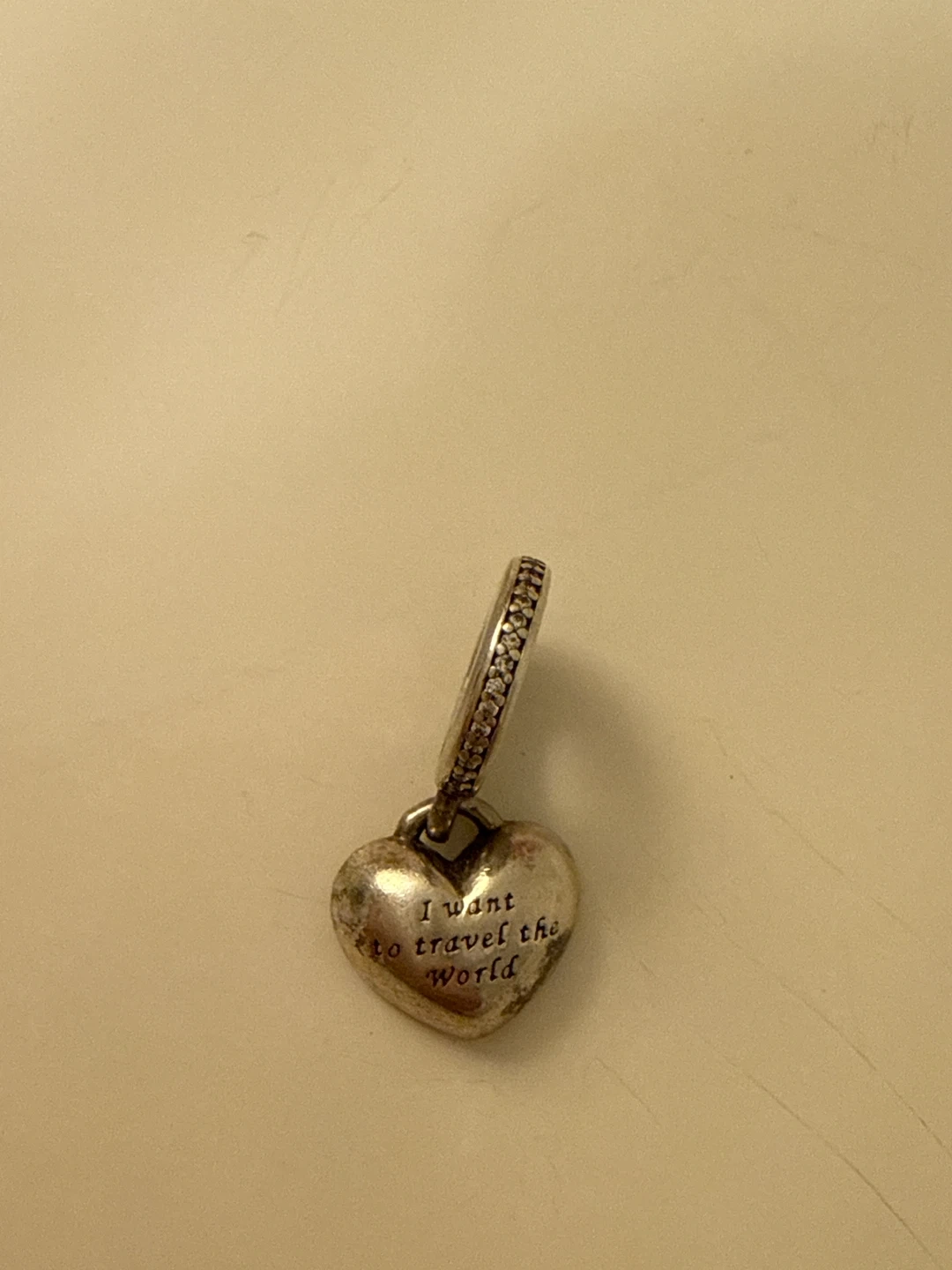 102Selling a Pandora heart dangle charm. It has the inscription 'I want to travel the World' on one side and 'With You' on the other. The charm is made of sterling silver and has some cubic zirconia detailing around the bail. It's in good condition and would be a lovely addition to your Pandora bracelet!