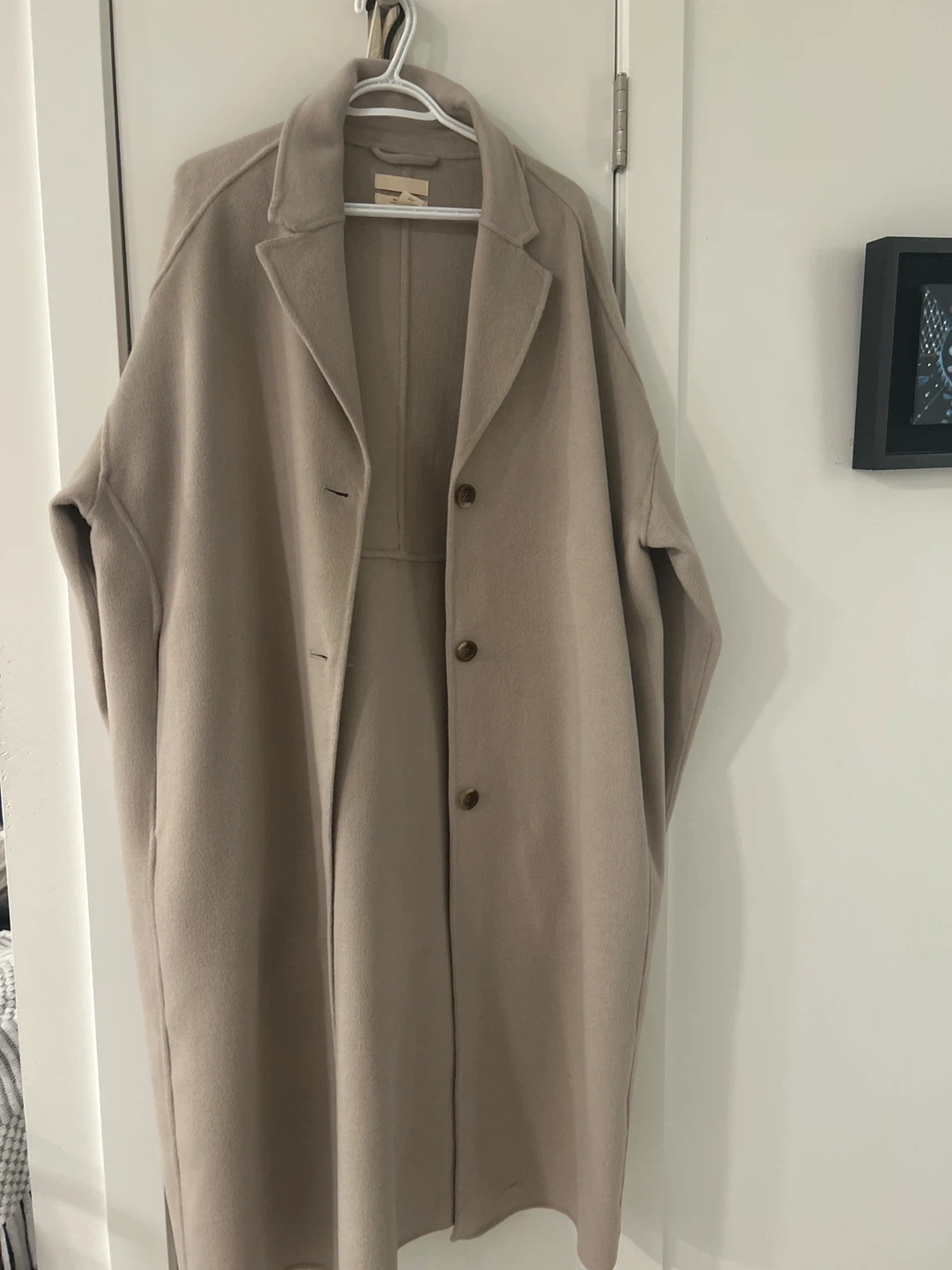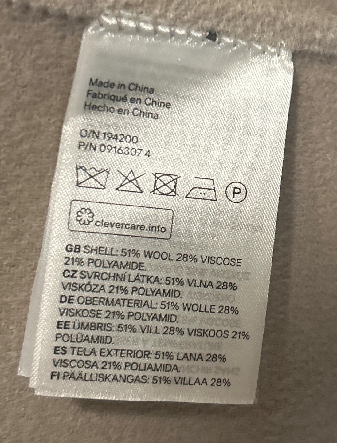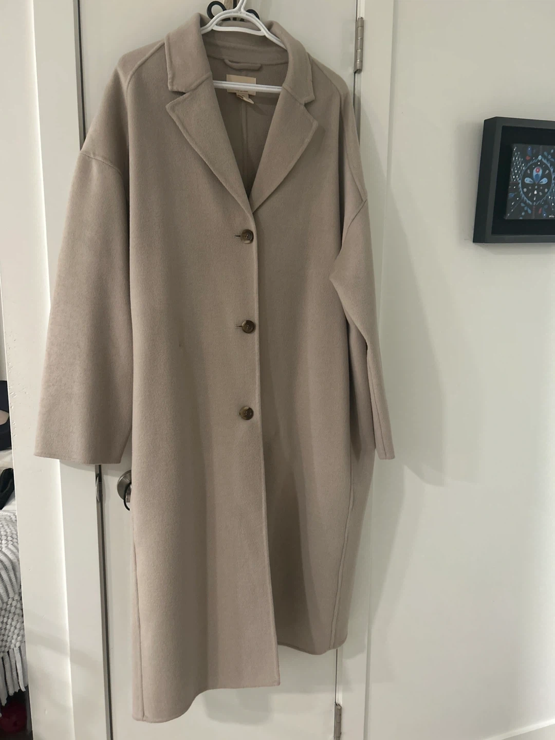 It run a bit large. Worn just once due to WFH. Selling a lovely H&M wool blend coat in a neutral beige colour. The material is a blend of 51% wool, 28% viscose, and 21% polyamide. Perfect for layering during the cooler months!