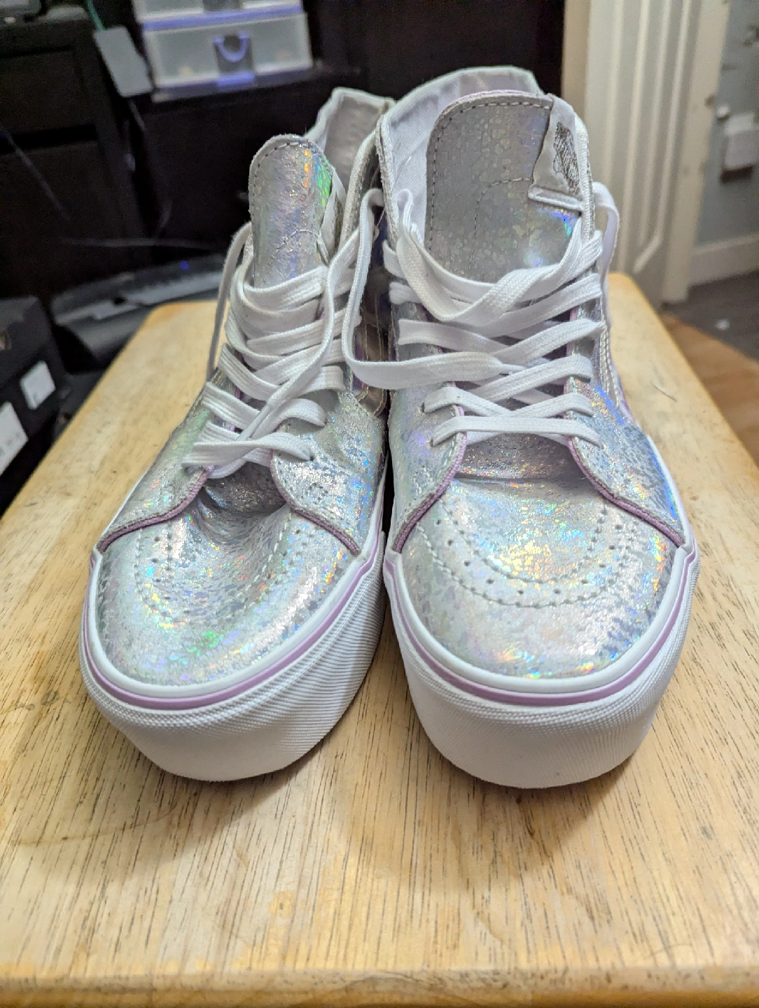 Selling a pair of Vans Sk8-Hi Tapered in the Butterfly Dreams design! These are a women's size 10.5, which translates to a men's size 9. They have a really cool holographic look to them!