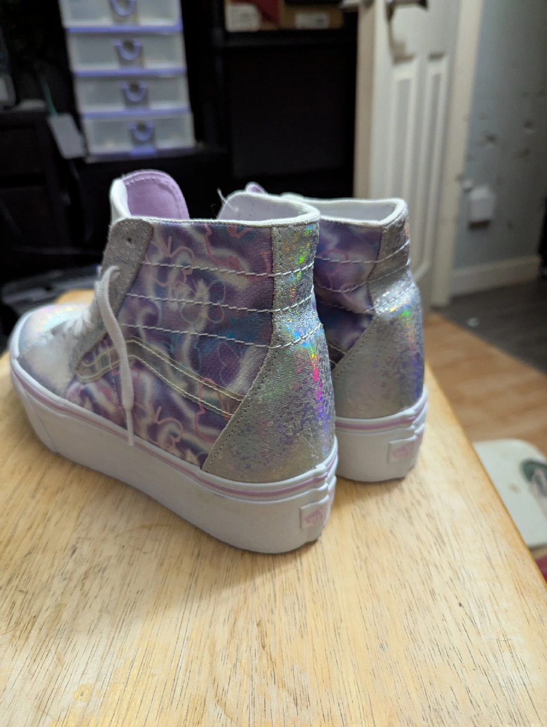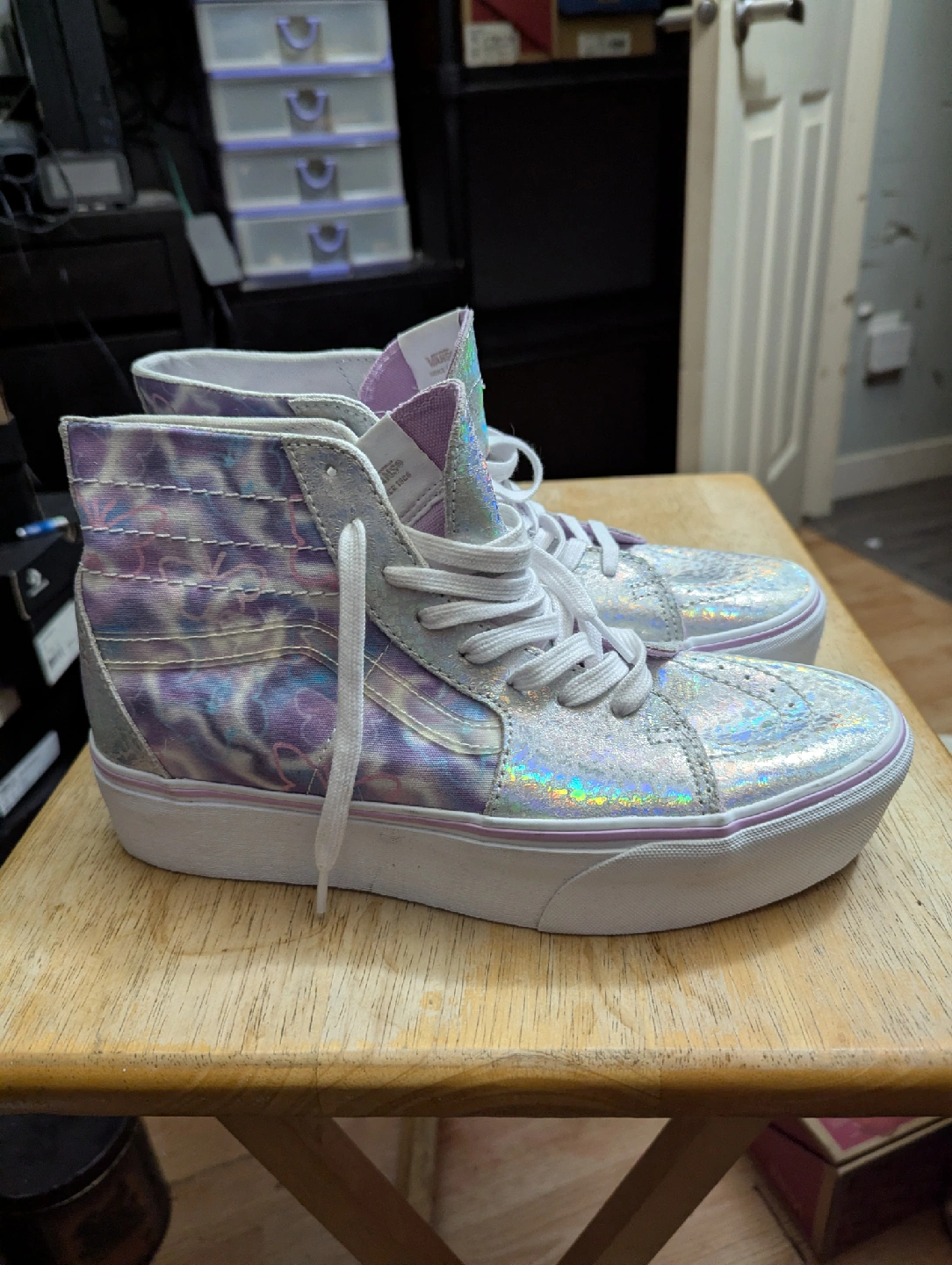 Selling a pair of Vans Sk8-Hi Tapered in the Butterfly Dreams design! These are a women's size 10.5, which translates to a men's size 9. They have a really cool holographic look to them!