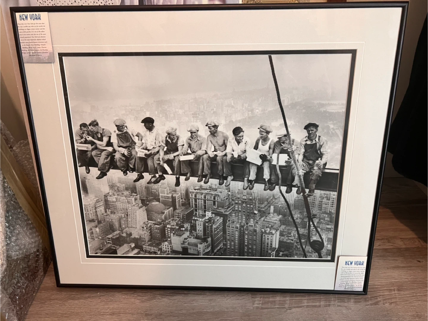 A framed black and white photograph of construction workers sitting on a beam high above New York City. It's a striking piece that would look great in any home or office