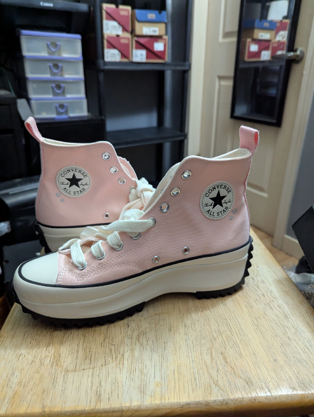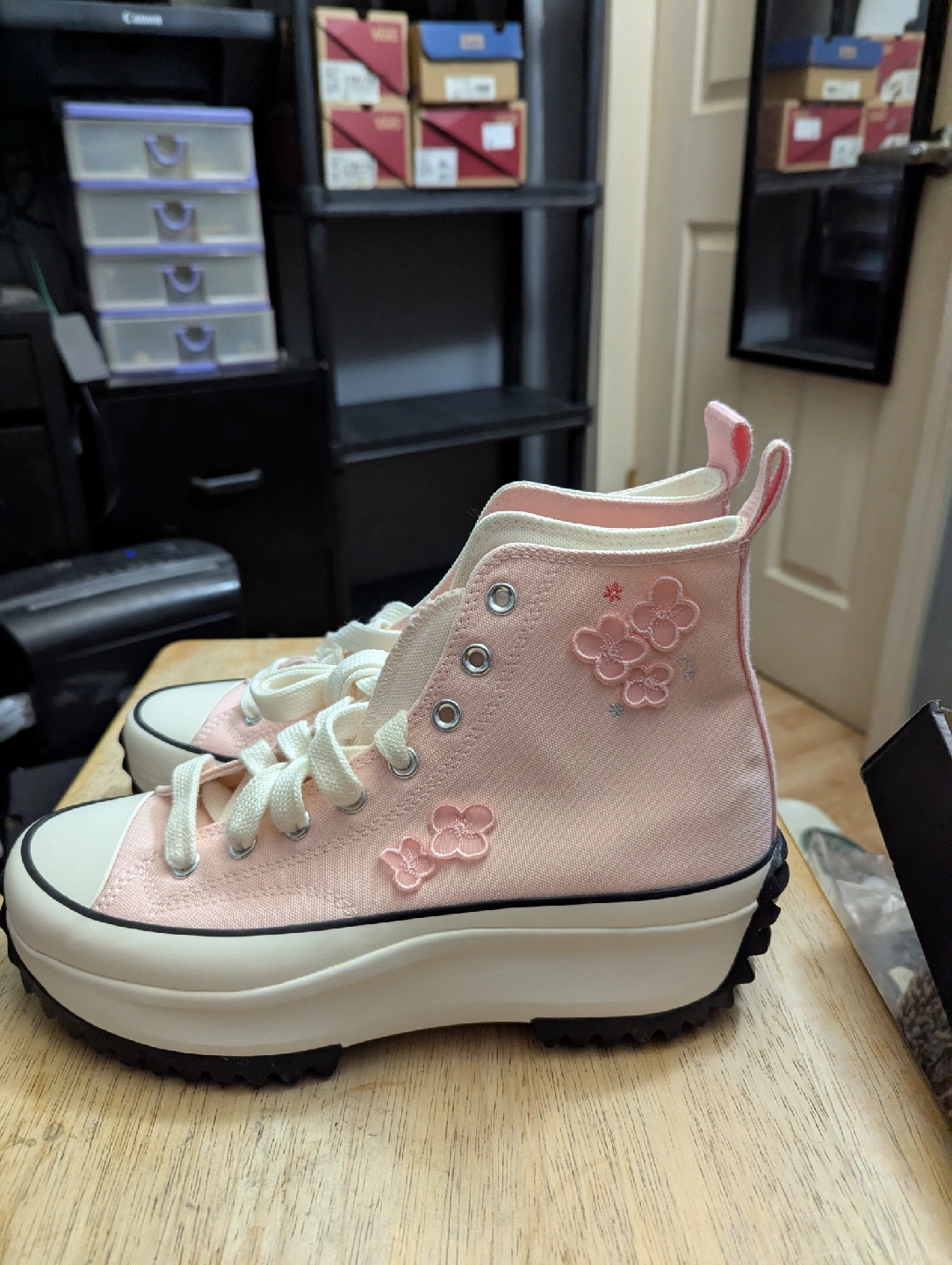 Selling a pair of Converse Run Star Hike high tops in women's size 10.5! They are a lovely pink colour with cute floral details. The shoes are in excellent condition and come with the original box!