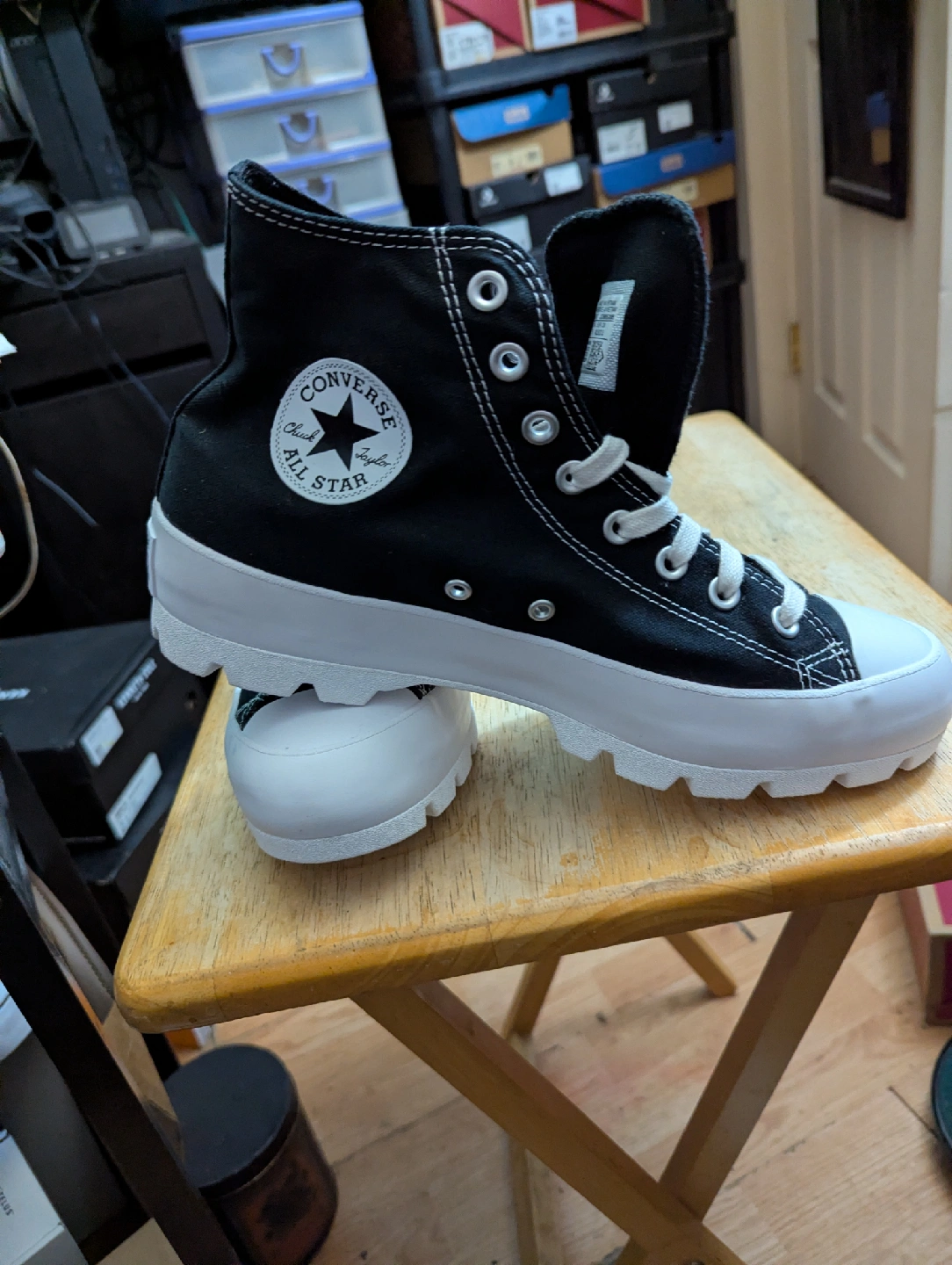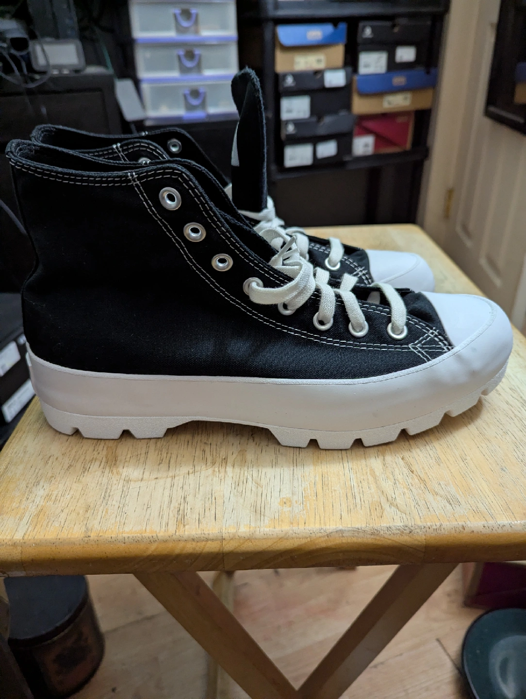 Selling a pair of Converse All Star Lugged High Tops in black and white. They are a women's size 11 US. These shoes are in great condition and ready for a new home!