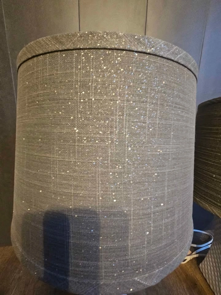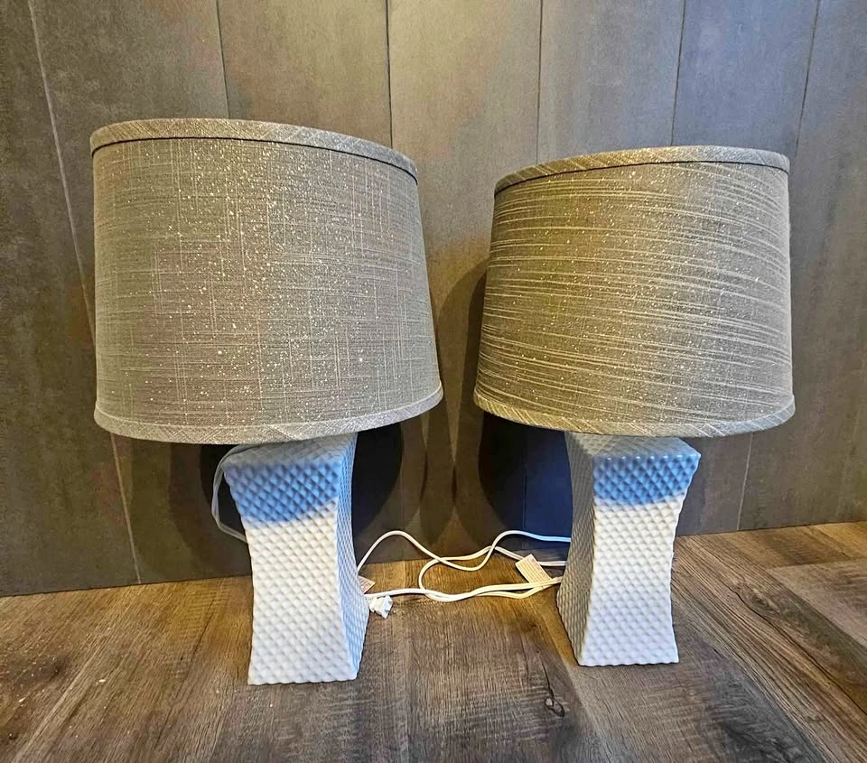 Sold as a pair. Base is white ceramic with 'quilted-look' pattern. Shades are gray metallic. Takes 120v tri-light bulbs. Smoke-free home. Approximate dimensions: Lamp base: 4 1/2" w x 11" h x 4' deep Lampshade: 10" diameter x 9" h