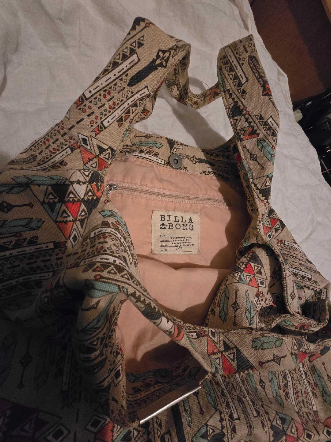 762Stylish Billabong tote bag featuring a unique tribal print. Perfect for everyday use, this bag is both fashionable and functional. It's in great condition and ready for a new home! Canvas Cotton with snaps Great s school bag and shopping bag. 14x18 inches 📌Please Pick up at M1R1S1 beside Esso 📌Cash please