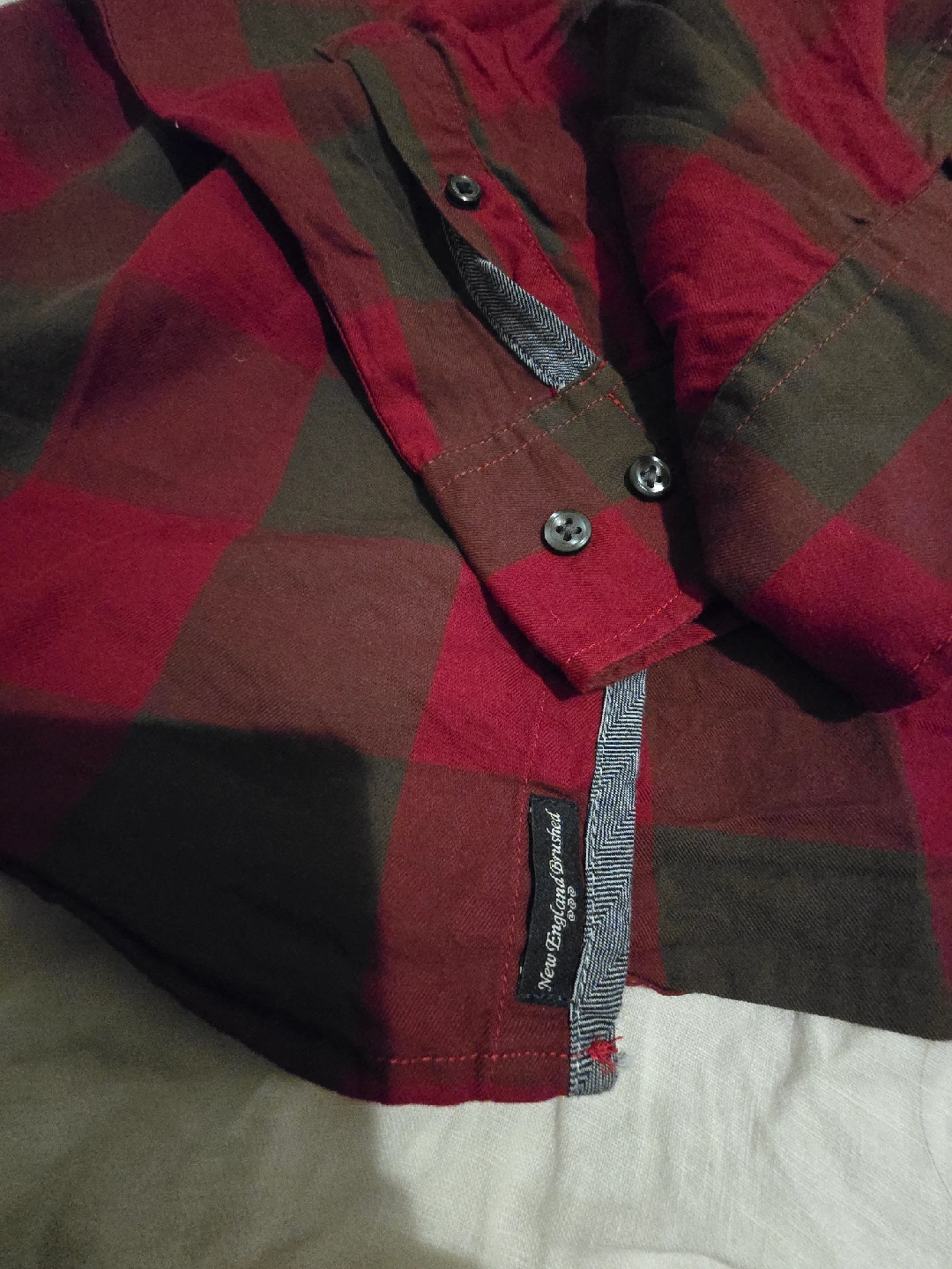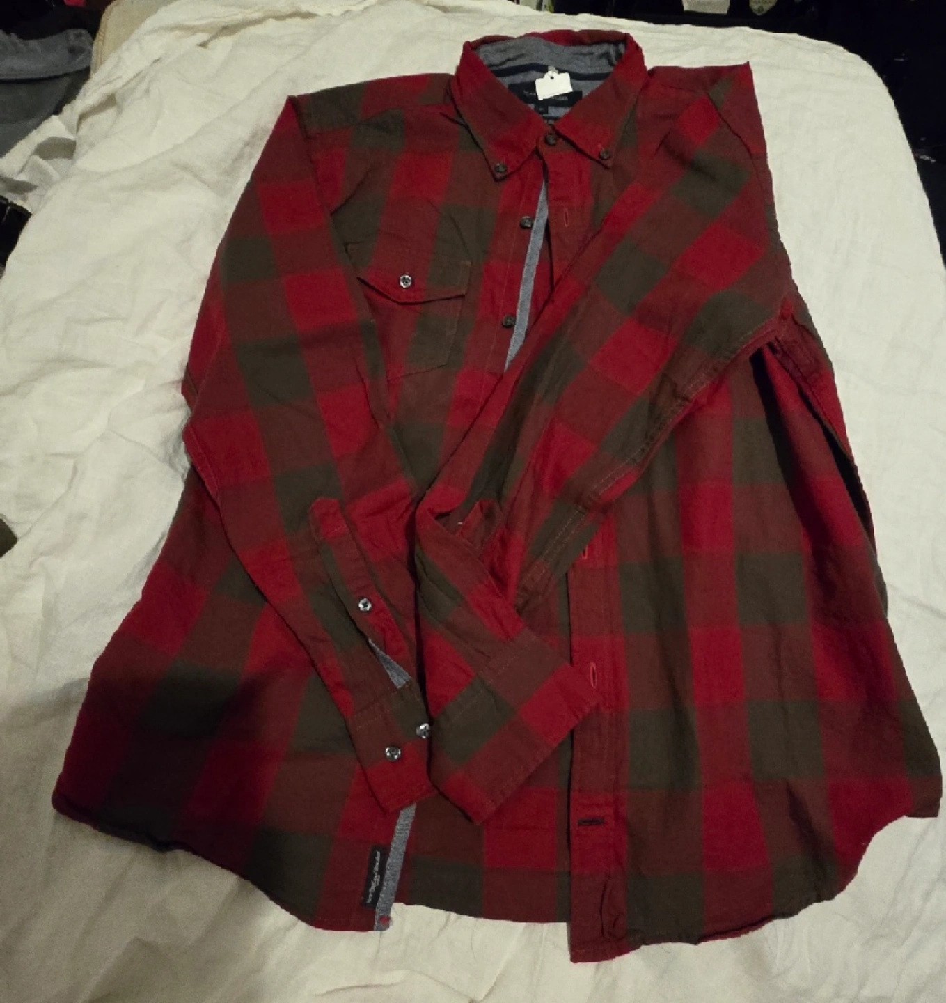 Selling a handsome Tommy Hilfiger button-down shirt in a red and brown plaid pattern. It's a New York Fit and size medium. In great condition and ready for a new home! Great fall and Christmas/holiday outfit and is great weather young or grands.
