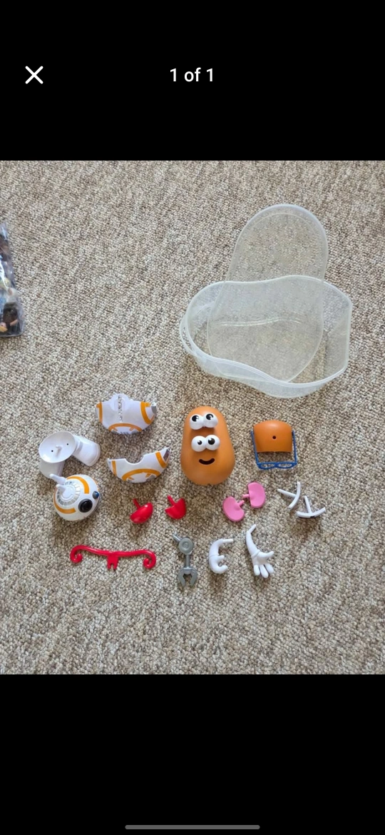 Selling a Mr. Potato Head toy with a bunch of fun accessories! It comes with different eyes, mouths, arms, and other silly parts to mix and match. The set also includes a handy container to keep everything organized. Perfect for creative play and laughs!