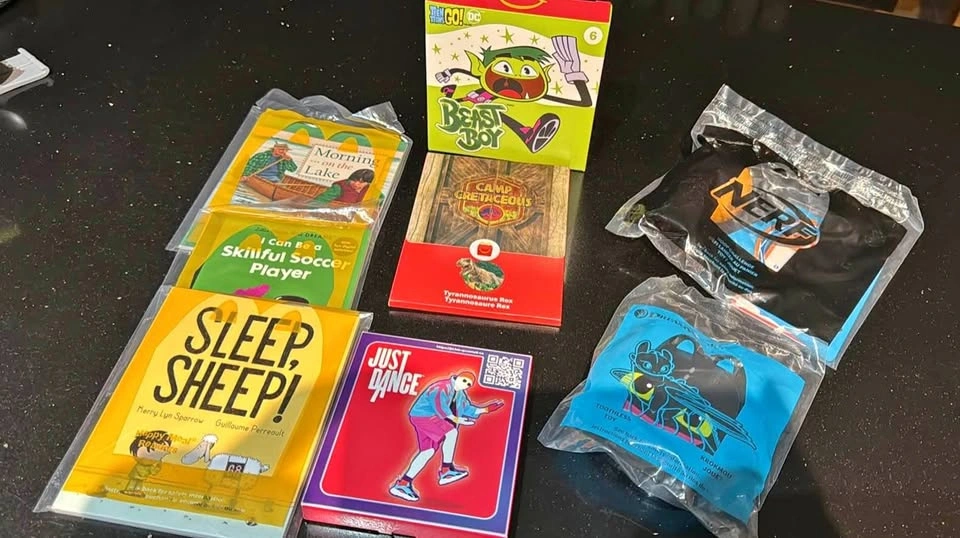 McDonald’s happy meal book/game/toys: Just Dance, Beast Boy, Jurassic World, How to Train your Dragon, Nerf hoop challenge. $3 for each bag of toys. Pickup near 200 & 72 in Langley