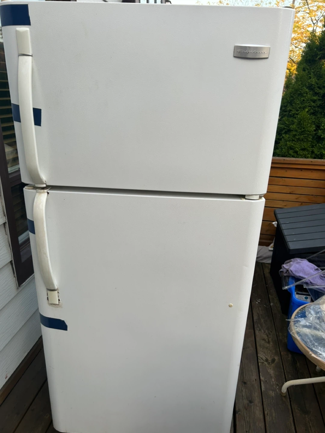Selling a white Frigidaire refrigerator. It's a great addition to any kitchen or garage for extra storage. Please note it has some wear and tear, as shown in the photos. Works fine 30x30 about 6 feet tall.