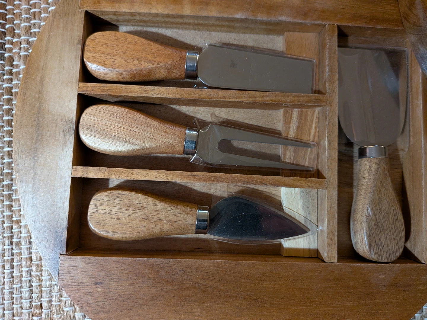 Selling a lovely cheese board complete with utensils! The board has a beautiful wooden finish and features engravings of different cheeses like Parmesan, Provolone, and Ricotta. It comes with a set of cheese knives and a fork, neatly stored in a wooden box. Perfect for your next gathering or a cozy night in! FCFS cross posted please checkout my other listings pickup location Oxford and Wonderland
