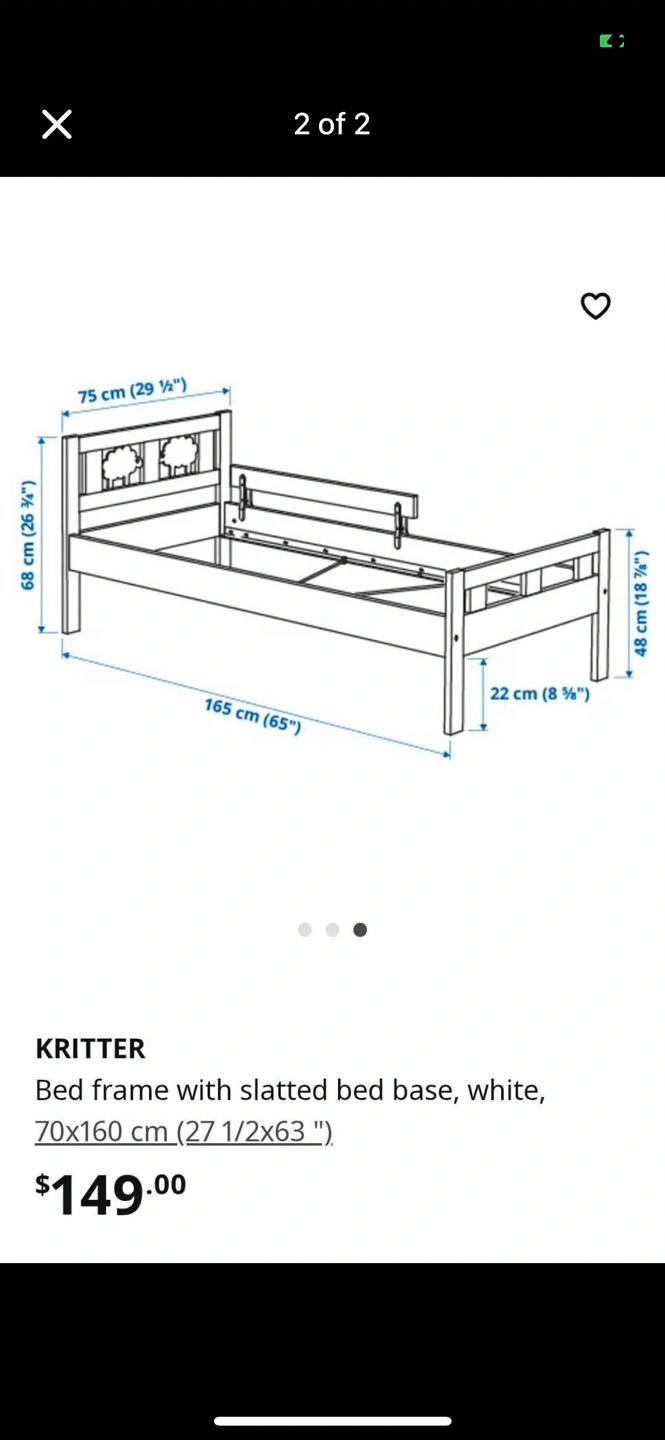 Selling an IKEA Kritter bed frame with slatted bed base. It's in great condition and ready for a new home. The dimensions are 70x160 cm, Save space. Already disassembled, easy to carry.