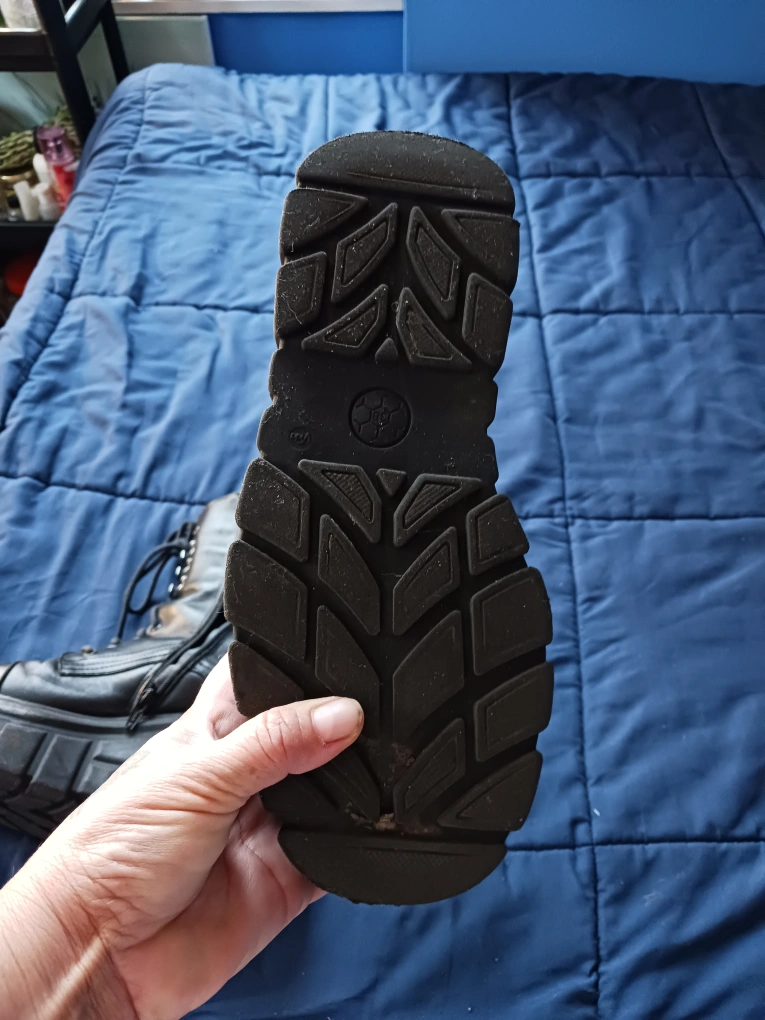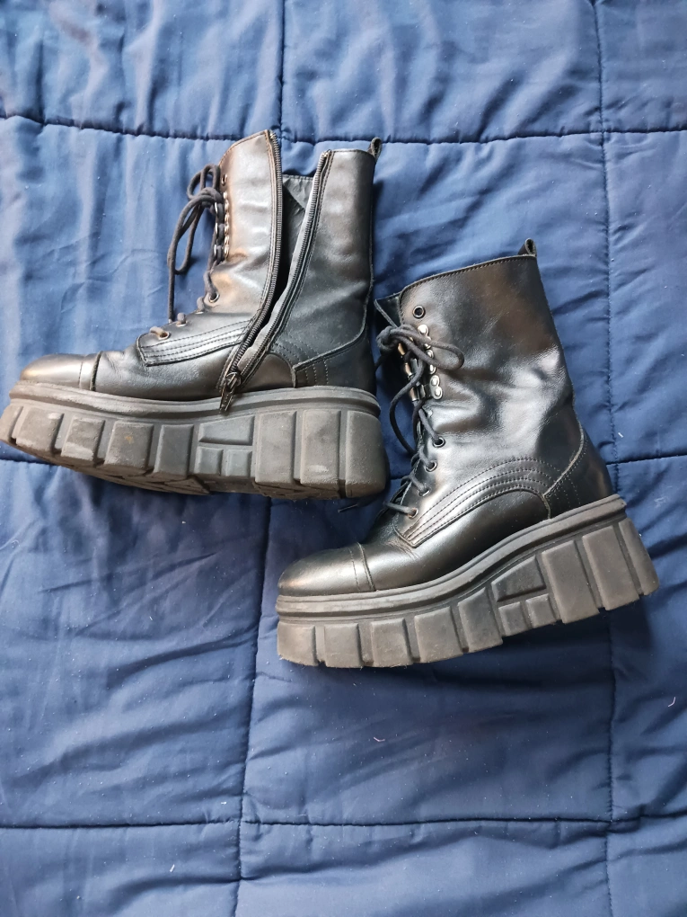 1000+Selling a pair of black platform boots in size 8. They have a lace-up design and a chunky platform sole. They show some signs of wear but are still in good condition for stomping around town! I bought them last year