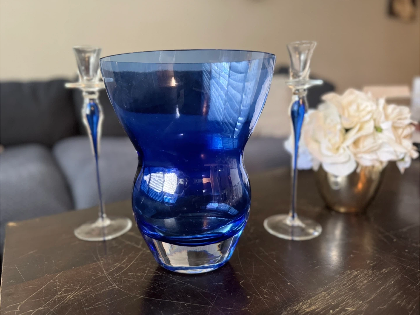 Selling a lovely blue glass vase and candlestick set. They would make a beautiful addition to any home decor! The vase has a unique shape and the candlesticks are tall and elegant