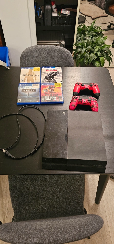 65Selling a used PlayStation 4 console. It comes with two controllers and four games: Uncharted Collection, Sniper Elite 4, Bioshock, and Red Dead Redemption II. no HDMI cable
