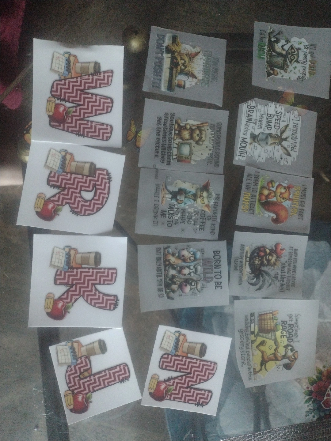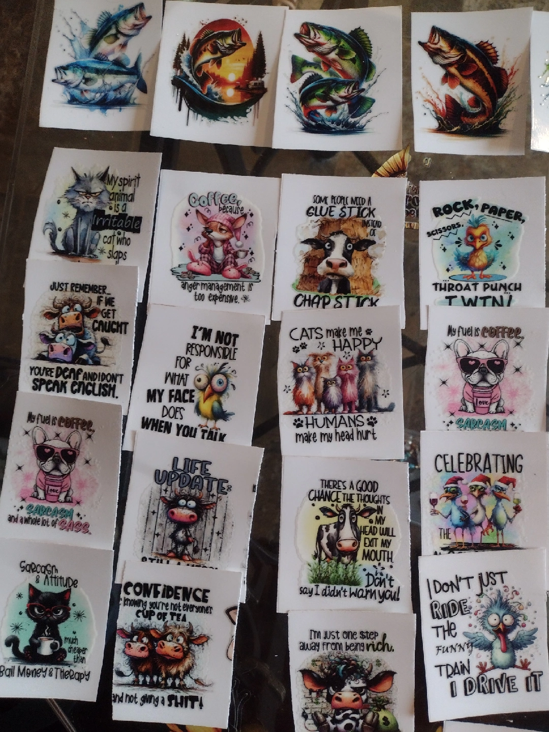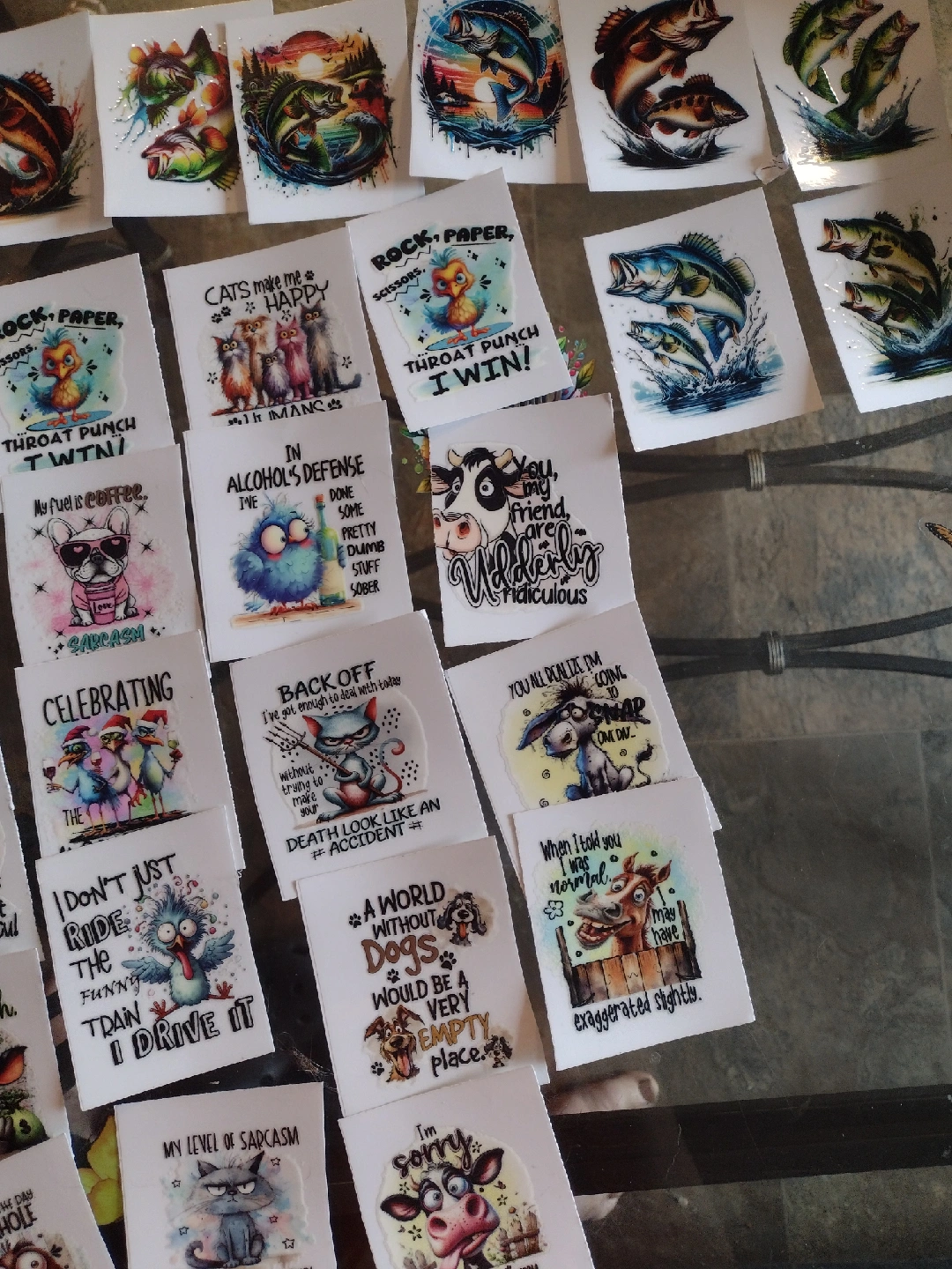 I. If you were to buy in bulk l would give you great deal. have a collection of decals for sale. They feature a variety of funny and cute designs, including cats, animals, and sayings. Great for adding some personality to your belongings! These Decals are transferable to Glass, Personal ltems. These are not lron ones. Asking $1 each.