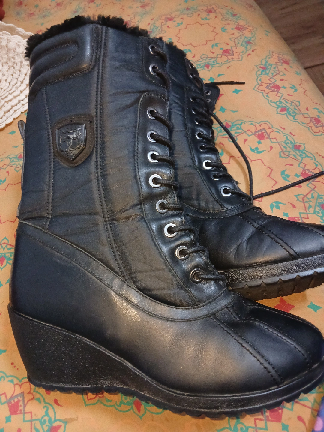 Selling a pair of Rudsak winter boots in black. They have a lace-up front and a wedge heel, perfect for keeping your feet warm and stylish during the colder months! They show some signs of wear, but are still in good condition.