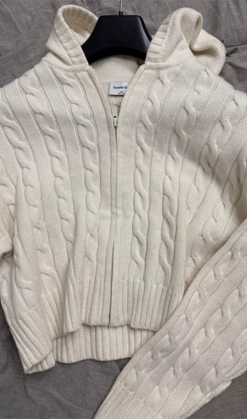 10Selling Aritzia Sunday Best Cream Cable Mnit Hoodie in size 2xs (fits like xs) It's a wool and cotton blend which makes it very warm and cozy Tags are off but it's never been worn. Retail is $128 + tax
