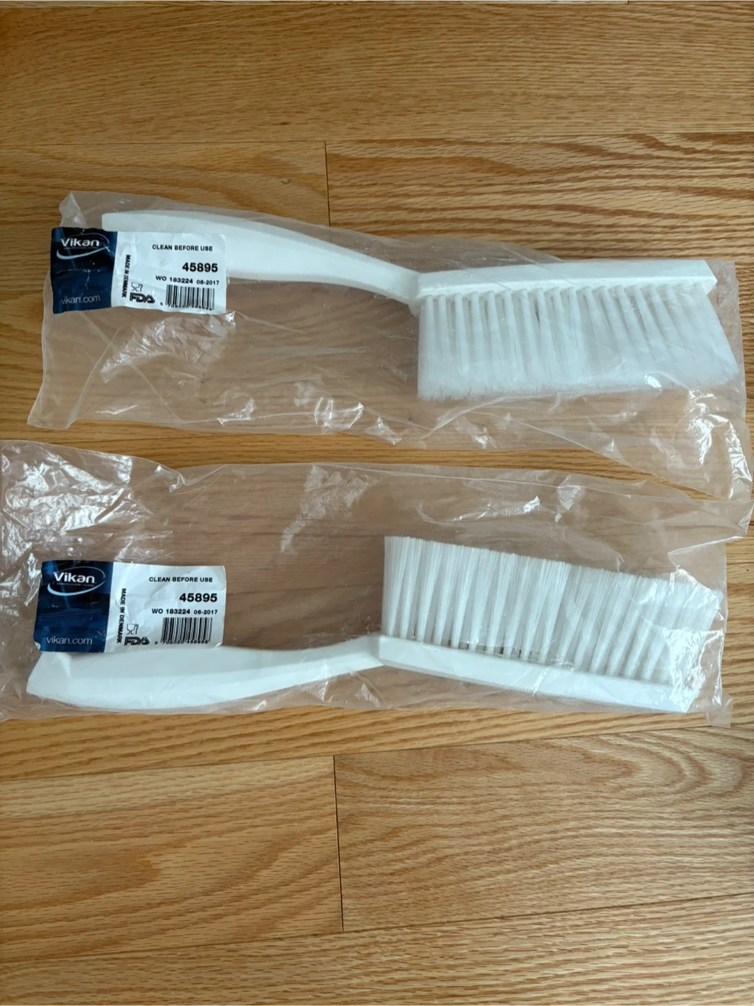 I'm selling 2 new Vikan white brush, still in its original packaging! The model number is 45895. It's made in Denmark and ready to help with your cleaning needs. It says 'Clean before use' on the packaging