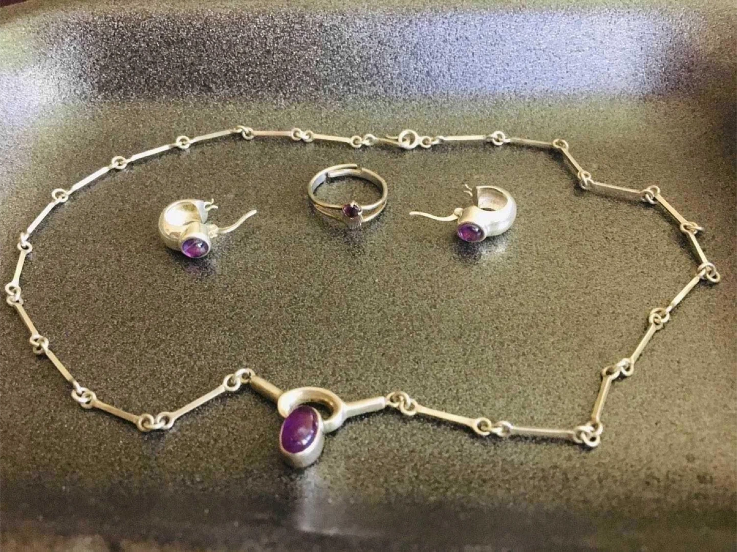 Buy & SellSterling Silver 925 Necklace, earrings, Ring w purple stonesSterling Silver 925 Necklace, earrings, Ring w purple stones$125SOLID 925 Sterling silver VINTAGE necklace, earrings and ring set! The set features lovely purple amethyst stones.0 chats·0 favorites·2 viewsSELLERHelenFalaise643 reviewsWHERE TO MEETRoyal Oak Estates