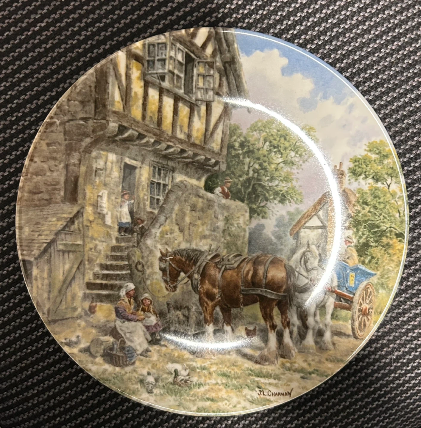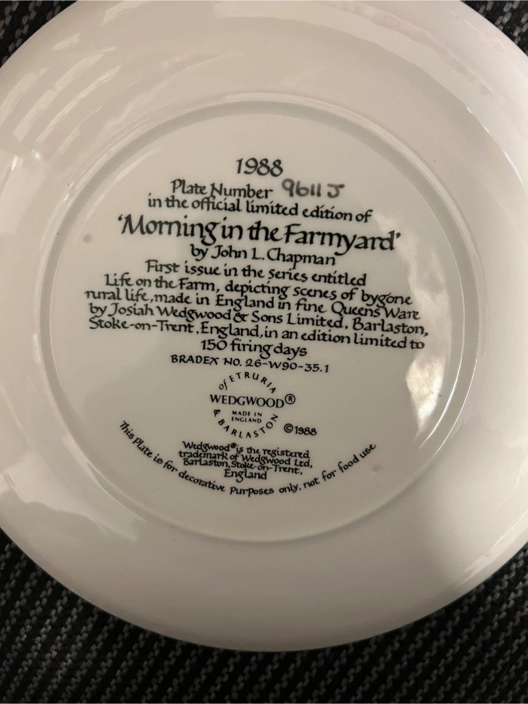 65Selling a Wedgwood decorative plate titled 'Morning in the Farmyard' by John L. Chapman. This plate is the first issue in the series, depicting scenes of bygone rural life. Made in England in fine Queens Ware by Josiah Wedgwood & Sons Limited. It's a limited edition plate. Plate number 9611J. This plate is for decorative purposes only, not for food use