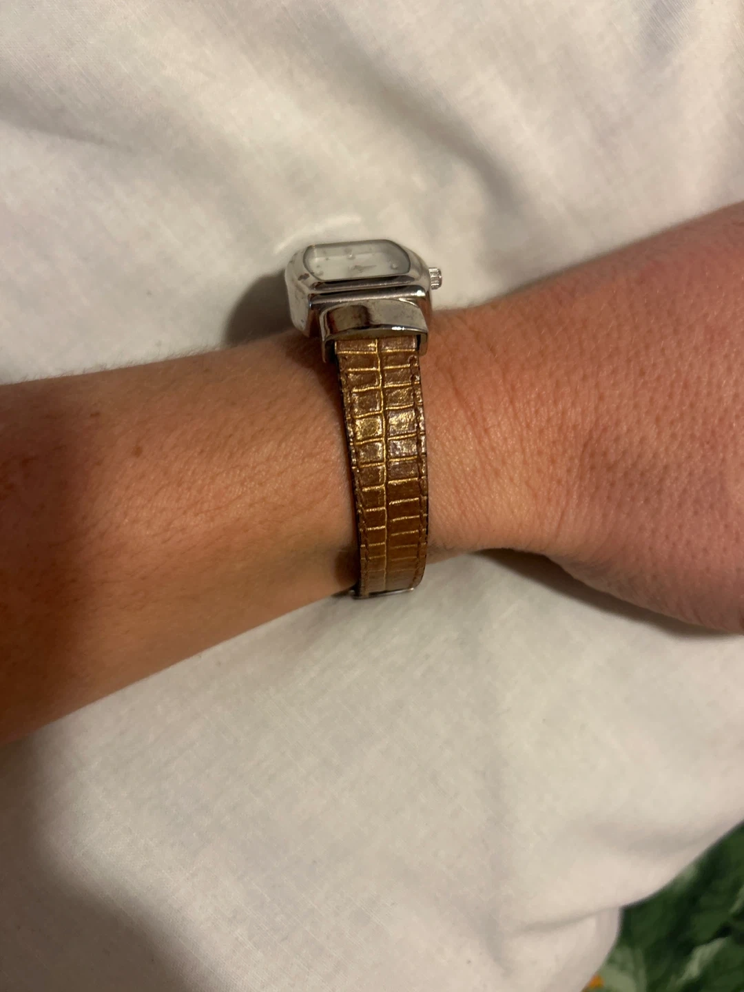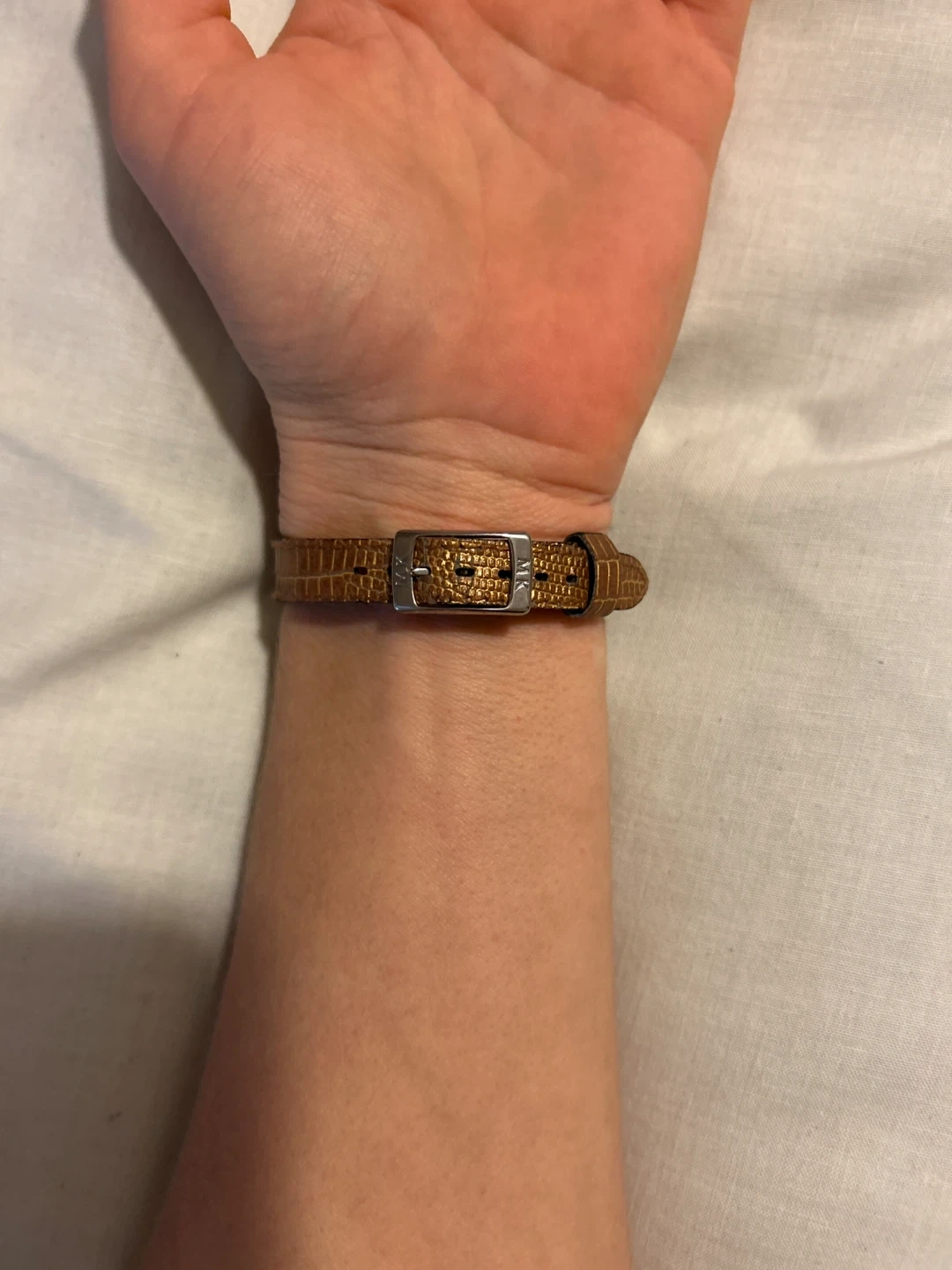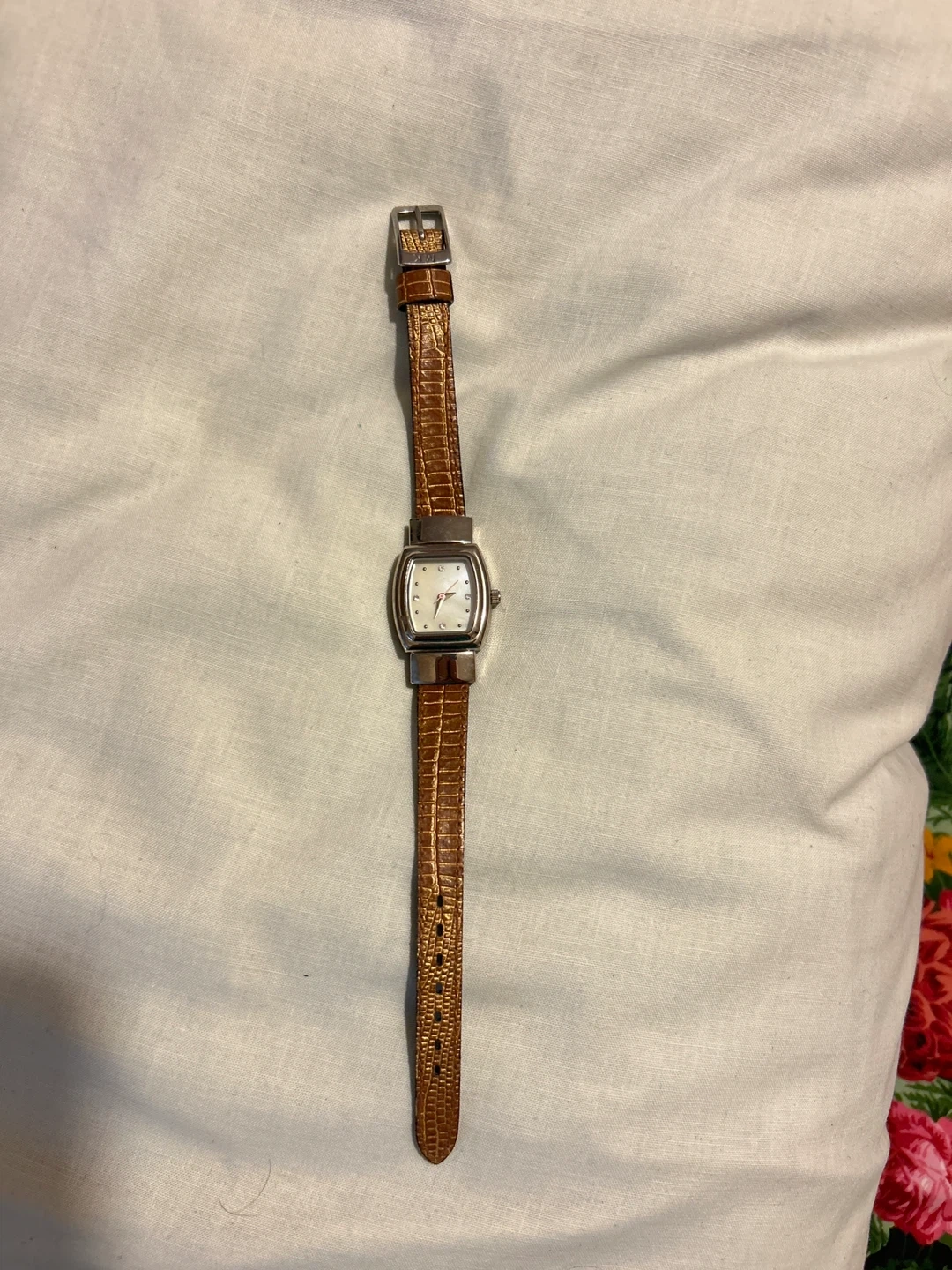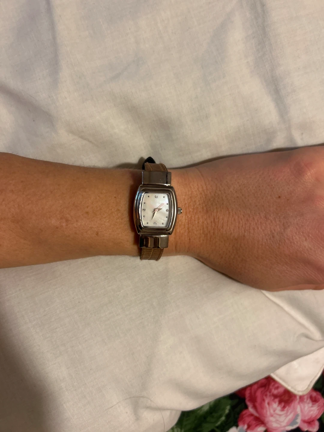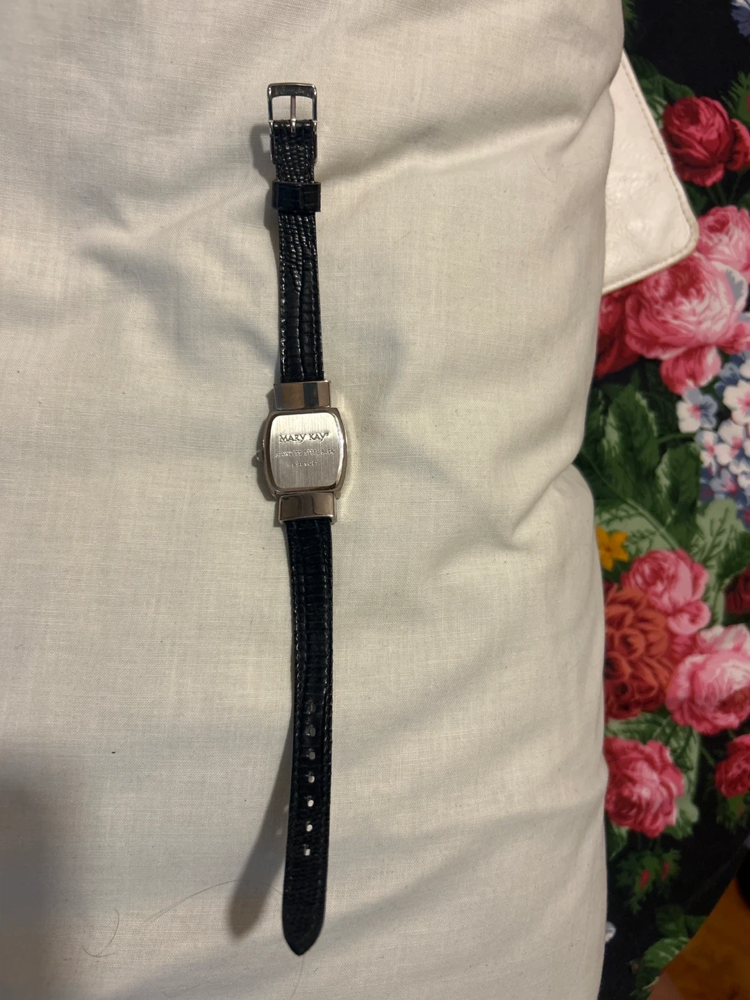 Selling a vintage Mary Kay consultant watch. The face js mother of pearl and the reversible band is leather. one side black and the other a light brown. The casing is silver toned.