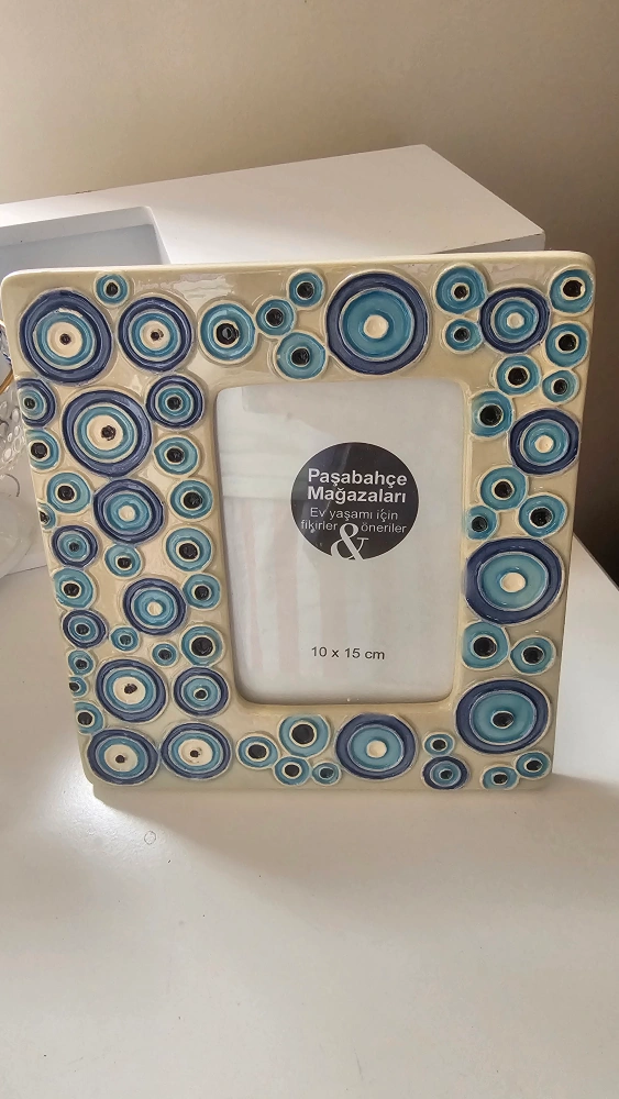 365This is a Paşabahçe photo frame perfect for displaying your favorite memories! It measures 10 x 15 cm and has a unique design with blue and white circles around the frame. It’s in great condition and ready to brighten up your space