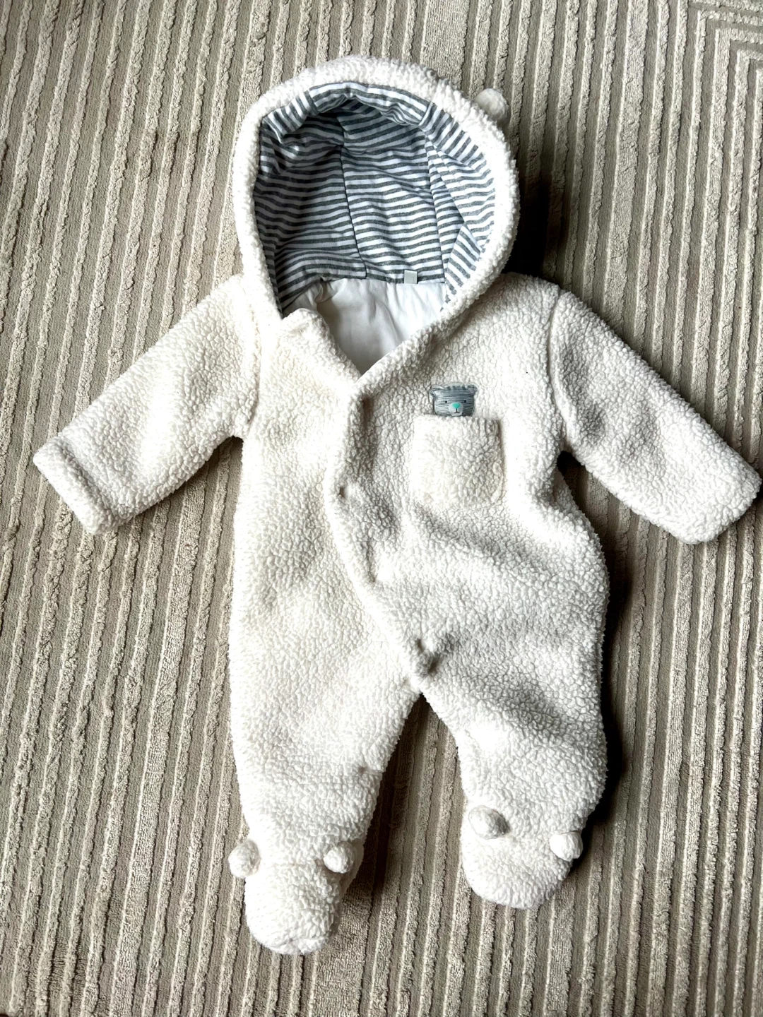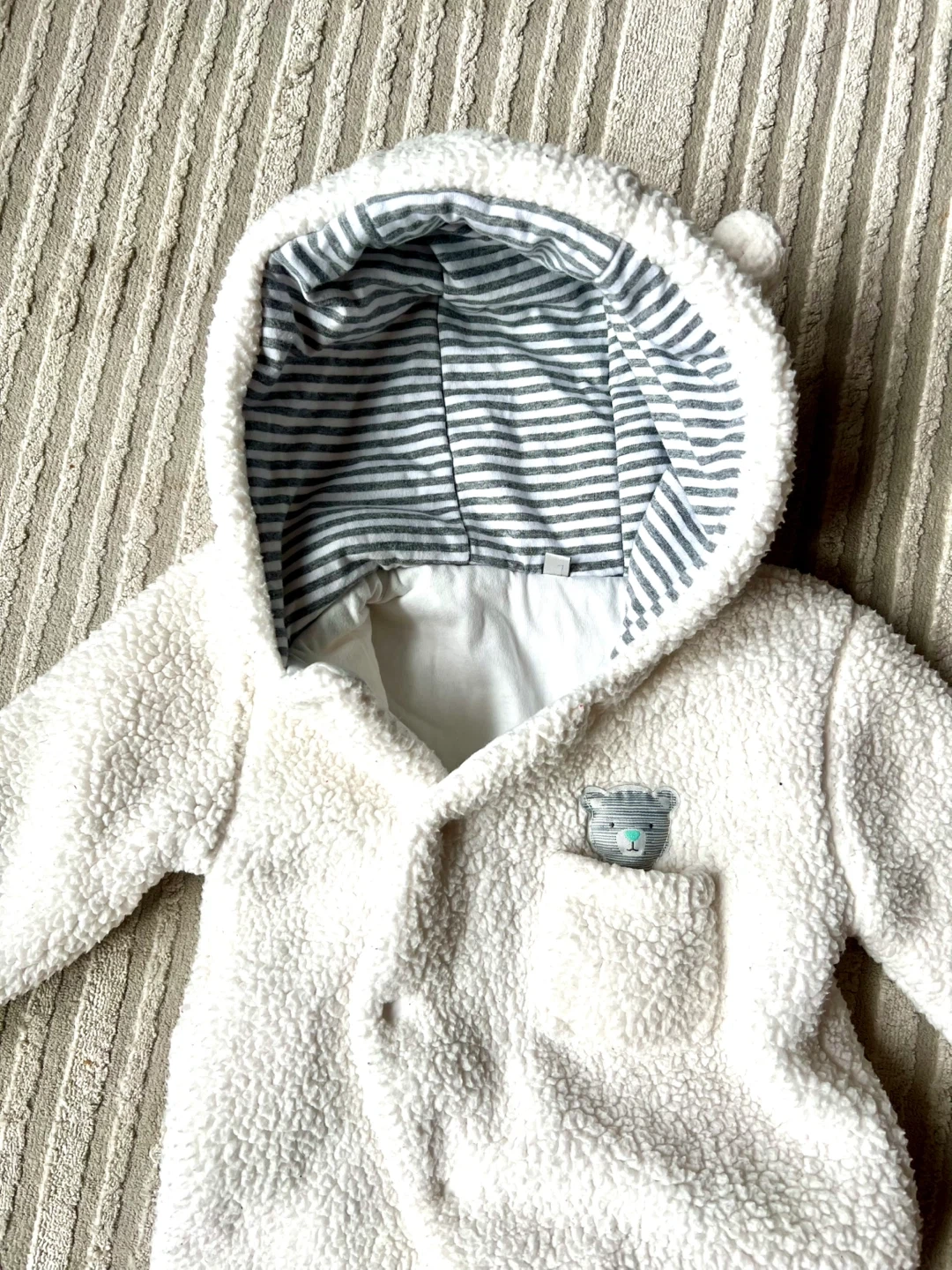 This adorable white bear cub onesie is perfect for keeping your little one cozy! It's in great condition and features a cute bear design on the pocket and ears on the hood. Size is 3-6 months, great for a growing baby!