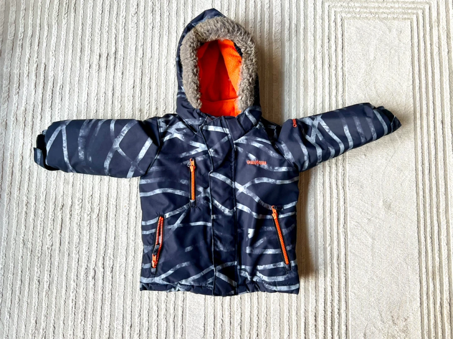 Keep your little one warm with this OshKosh B'gosh winter jacket! It features a cozy hood with faux fur trim and a bright orange fleece lining. The jacket is a size 5T and has a stylish black and grey patterned outer shell with orange zippers. Perfect for those chilly Canadian days!