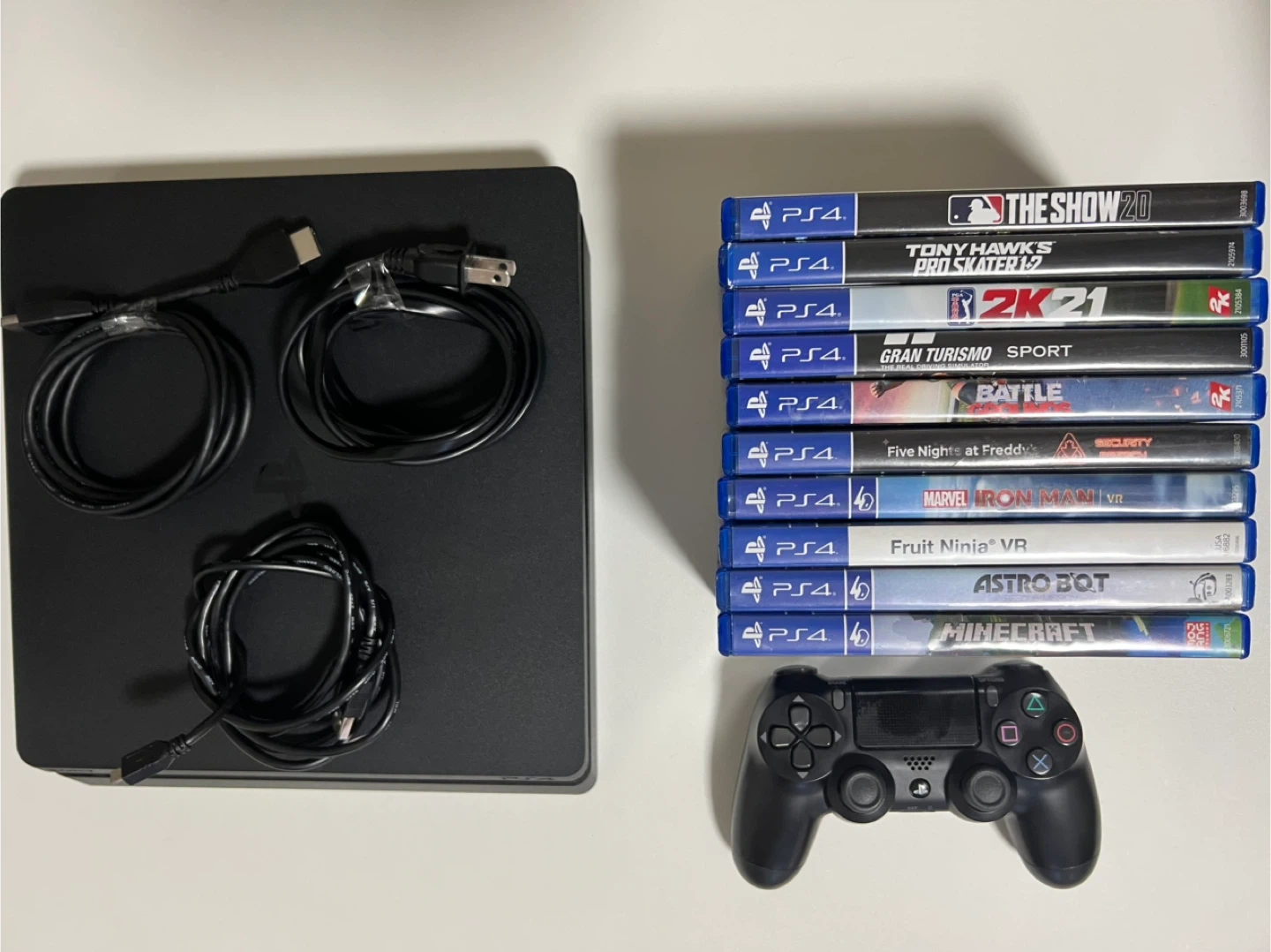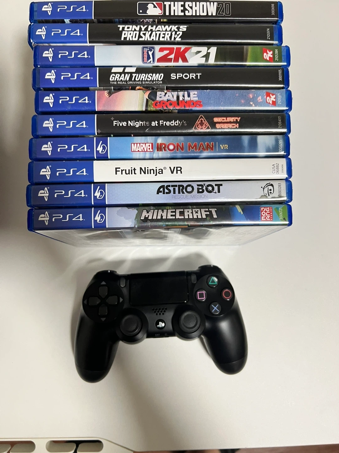 I'm selling a PlayStation 4 with a controller and a selection of disc-based games. It also includes a digital game. It includes all the cables needed to get started right away! Games include: - The Show 20 - Tony Hawk's Pro Skater 1+2 - 2K21 - Gran Turismo Sport - Battle Grounds - Five Nights at Freddy's Security Breach - Marvel Iron Man VR - Fruit Ninja VR - AstroBot - Minecraft The PS4 comes with a single controller, but I also sell controllers separately.