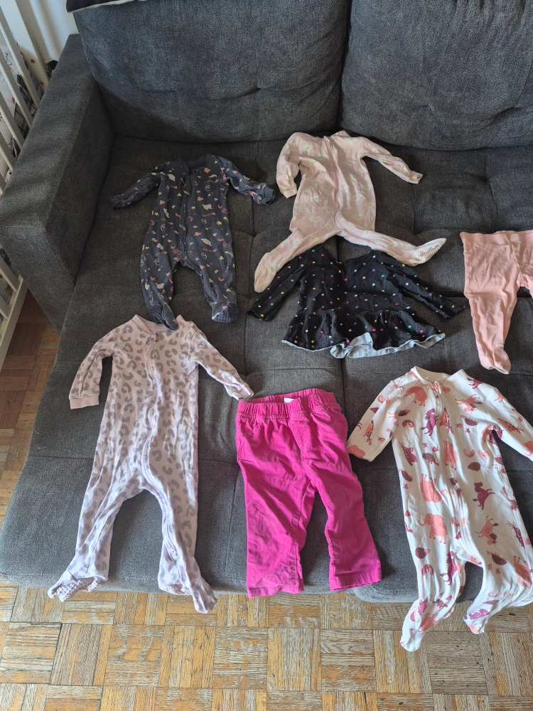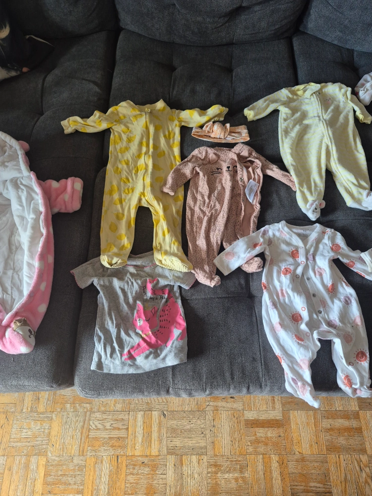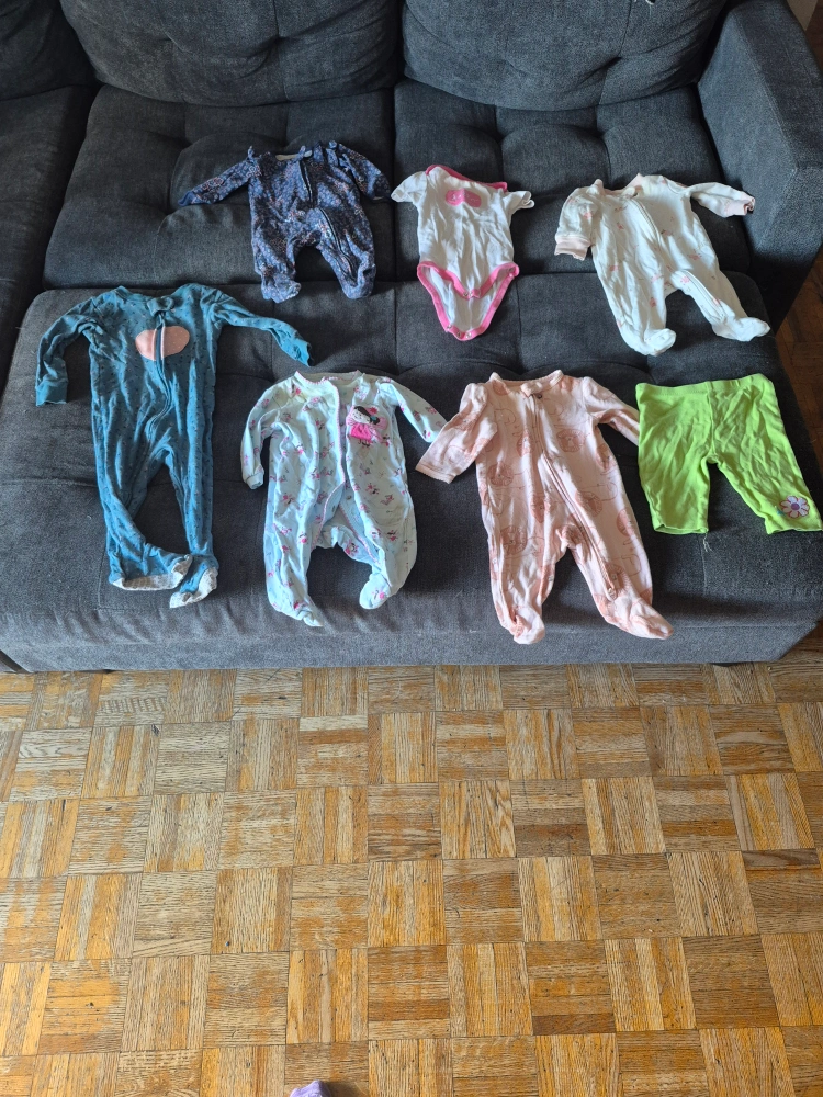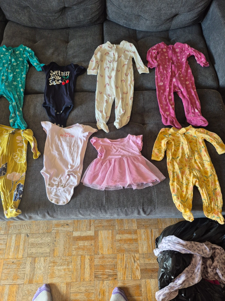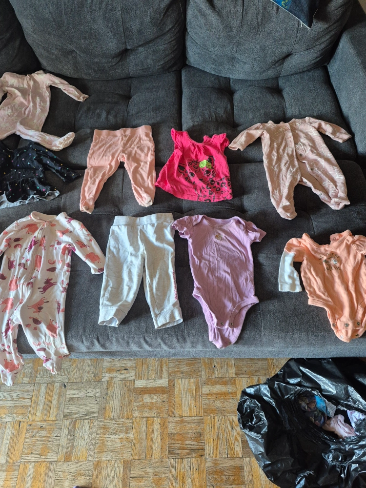 60Selling a bundle of gently used baby clothes! There's a variety of onesies, sleepers, pants, and a cute dress. All in great condition and ready for a new little one! I have more baby girl clothes from newborn to 9 months all in good condition. I have 2 garbage bags full $70 or best offer. Thank you