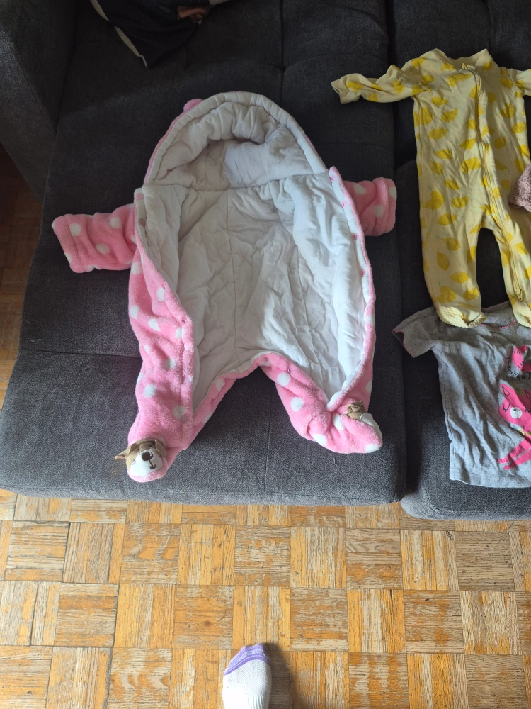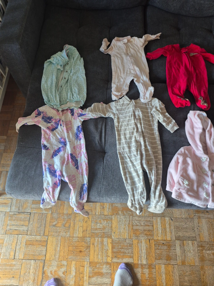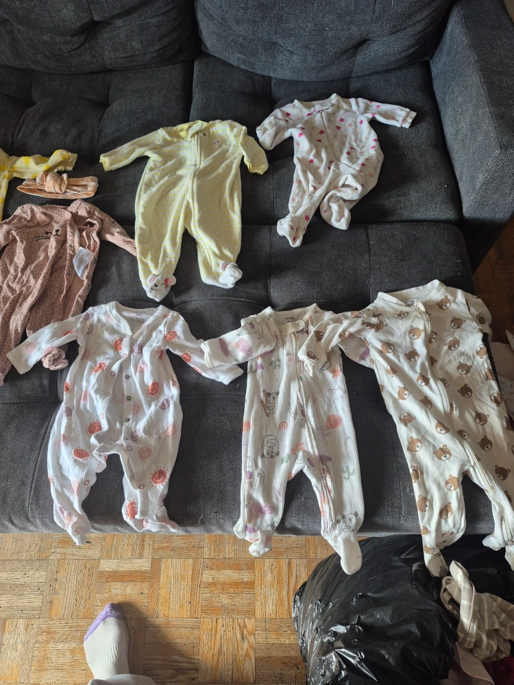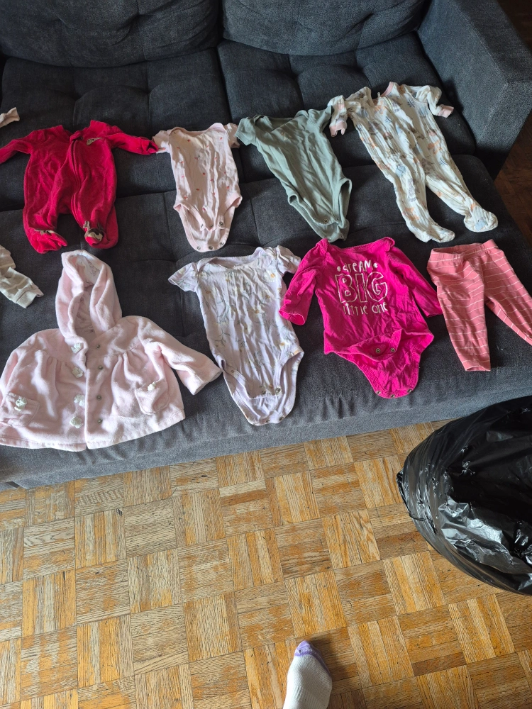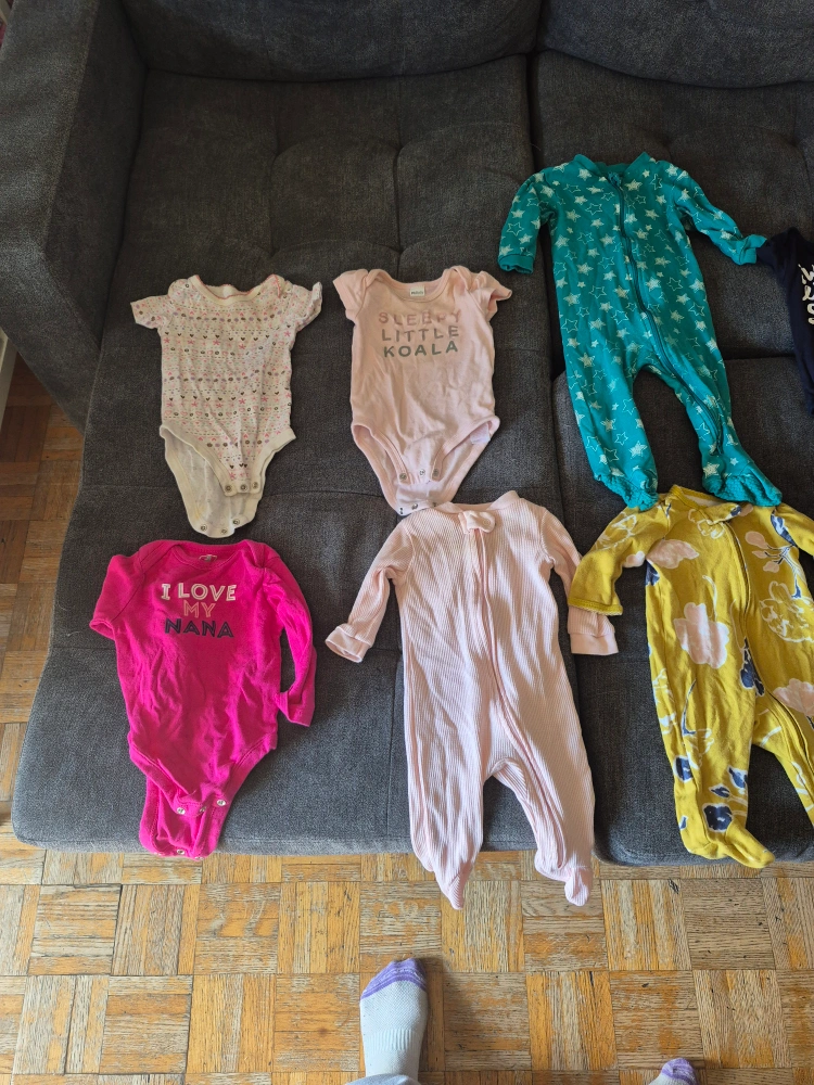 60Selling a bundle of gently used baby clothes! There's a variety of onesies, sleepers, pants, and a cute dress. All in great condition and ready for a new little one! I have more baby girl clothes from newborn to 9 months all in good condition. I have 2 garbage bags full $70 or best offer. Thank you