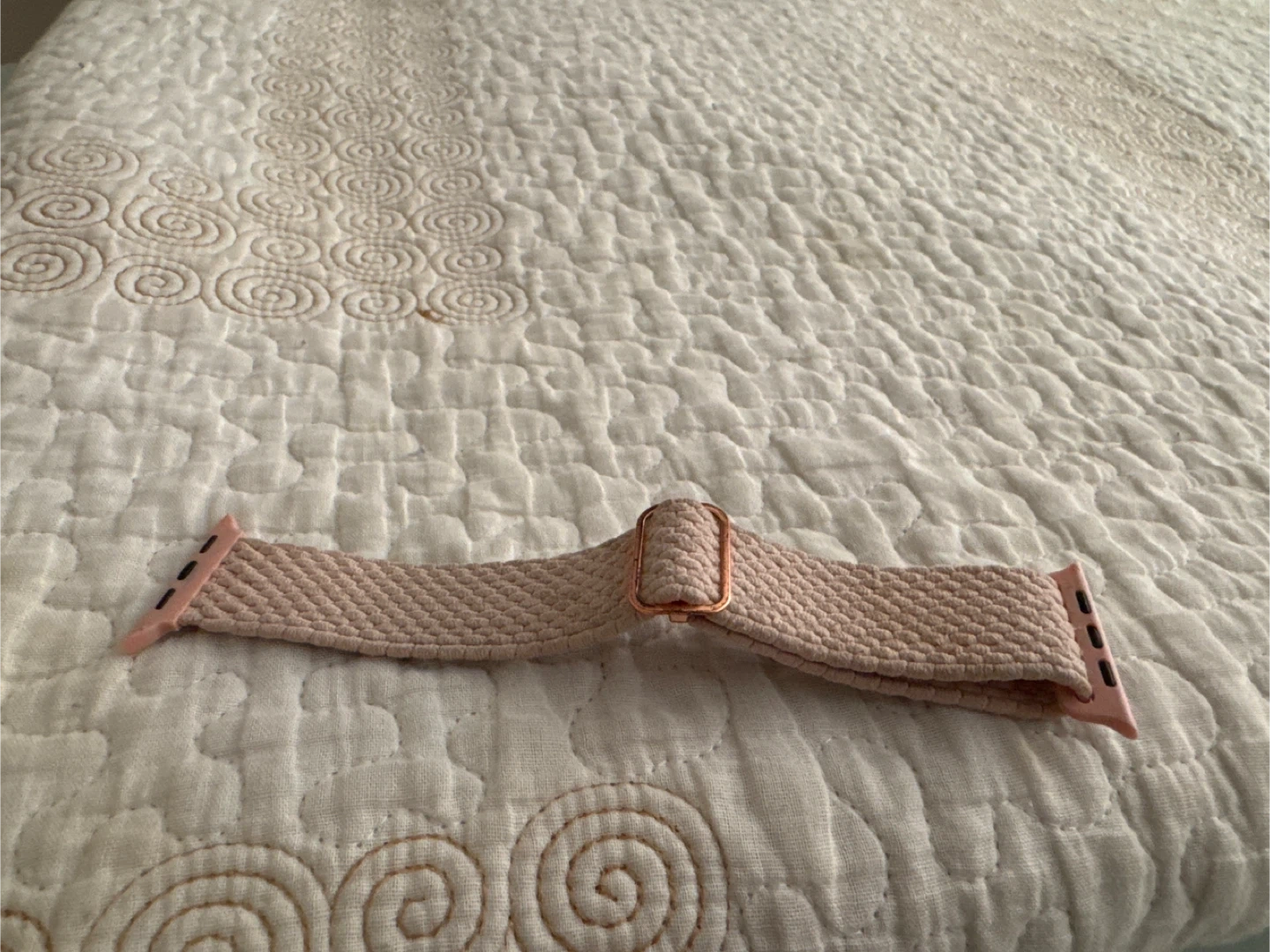 79Selling an Apple Braided Loop band . The band is a lovely light pink colour, perfect for adding a subtle touch to your Apple Watch Has slight dirt stains but if washed it will be good as new!