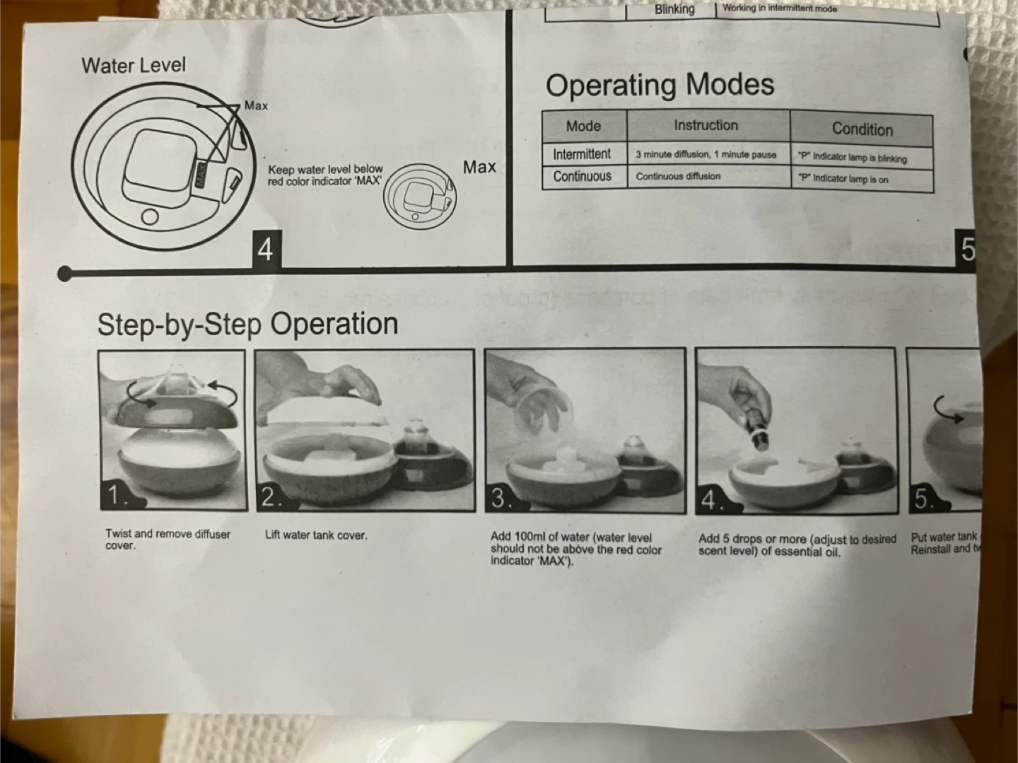 Selling an aroma essential oil diffuser. Like new. It comes with the user manual, power adapter, and a small measuring cup. It's easy to use with step-by-step operating instructions included.
