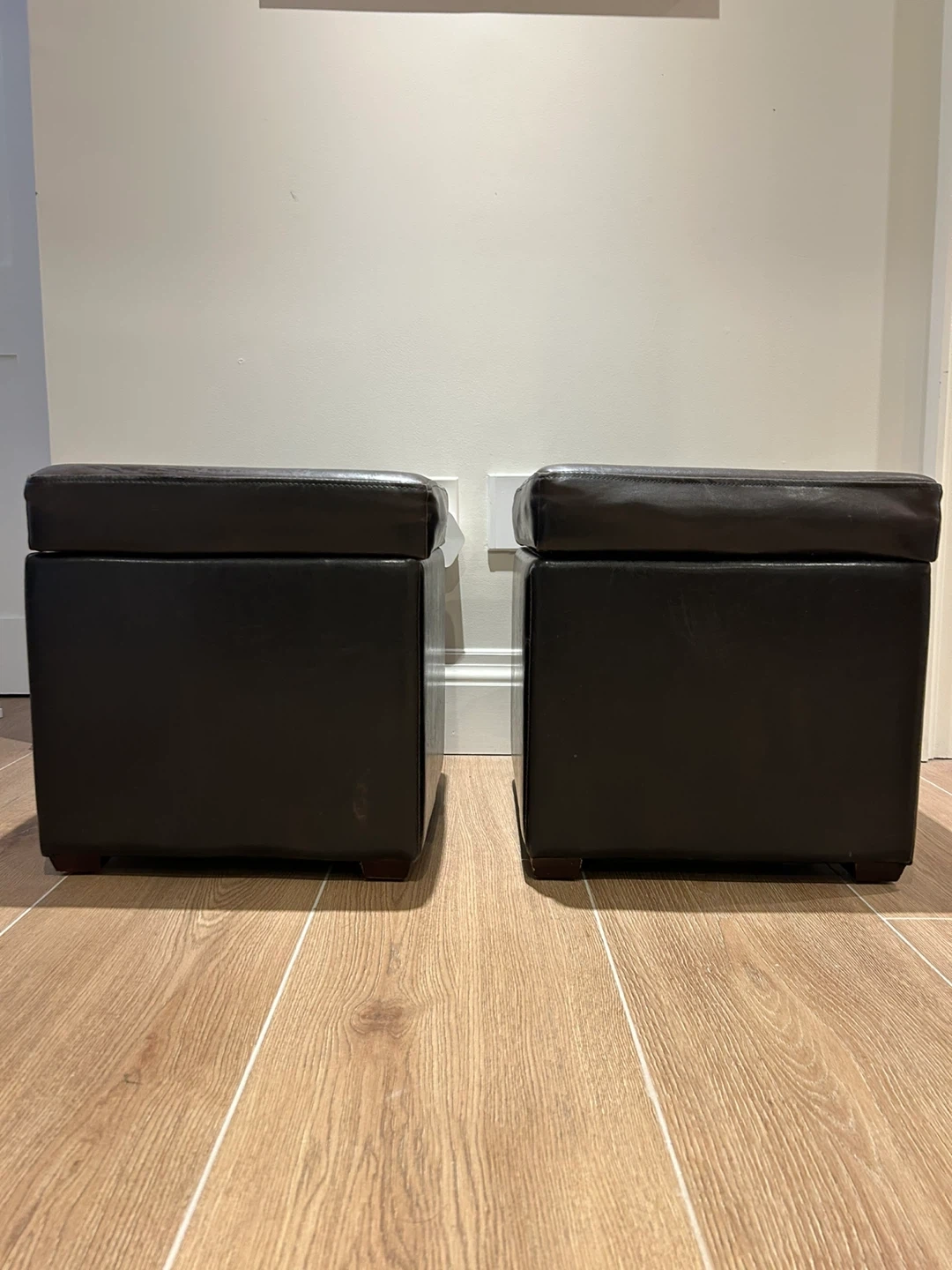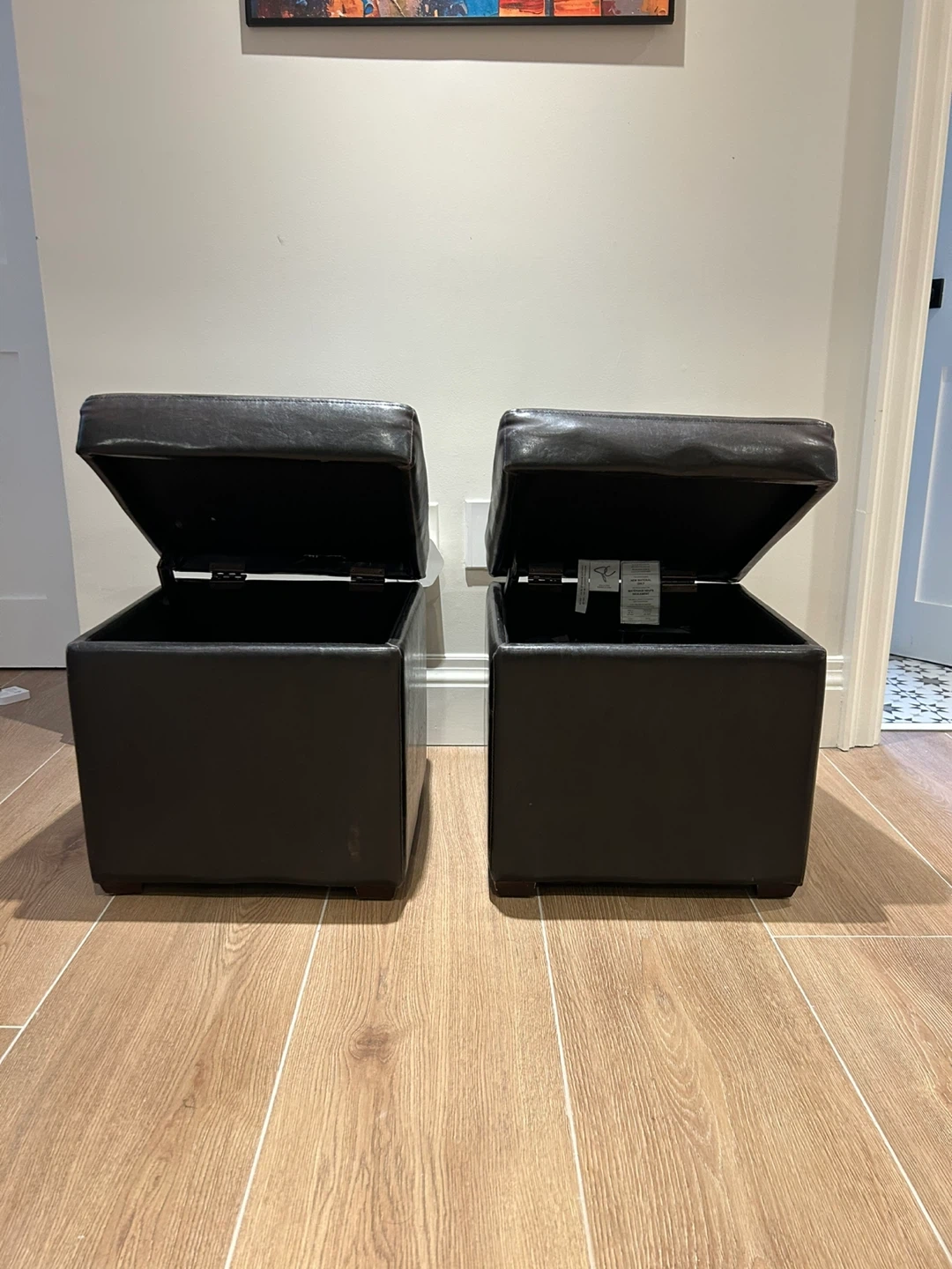 Selling a pair of faux leather storage ottomans. They're in good used condition and provide extra seating and storage. Perfect for any room in your home! Willing to negotiate price. Thank you