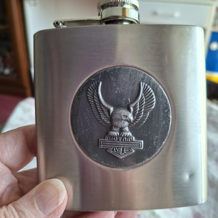 Here's a stainless steel flask with a Harley-Davidson logo on it. It's perfect for carrying your favourite drink on the go. It has a slight dent on the front as shown in the photo