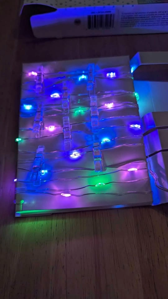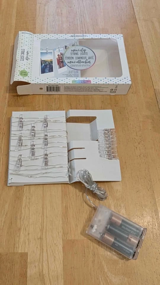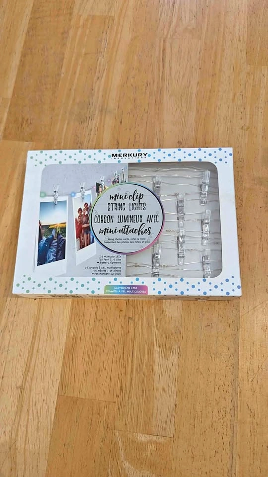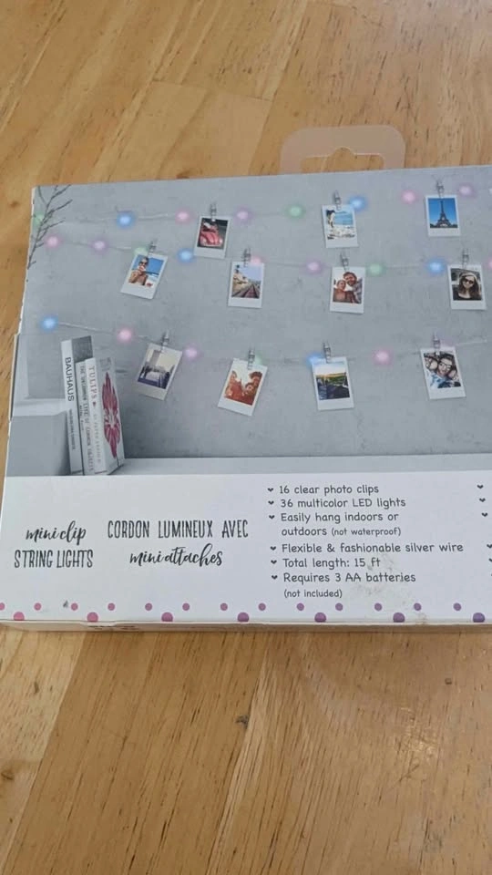 Brand New in Box. 16 clear photo clips. 36 multicolor LED lights. Total Length: 15 ft. Requires 3 AA batteries (not included). Pickup Scarborough, Morningside and Old Finch.