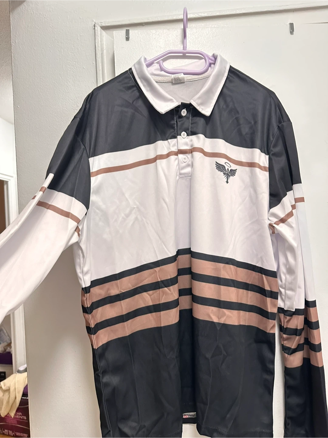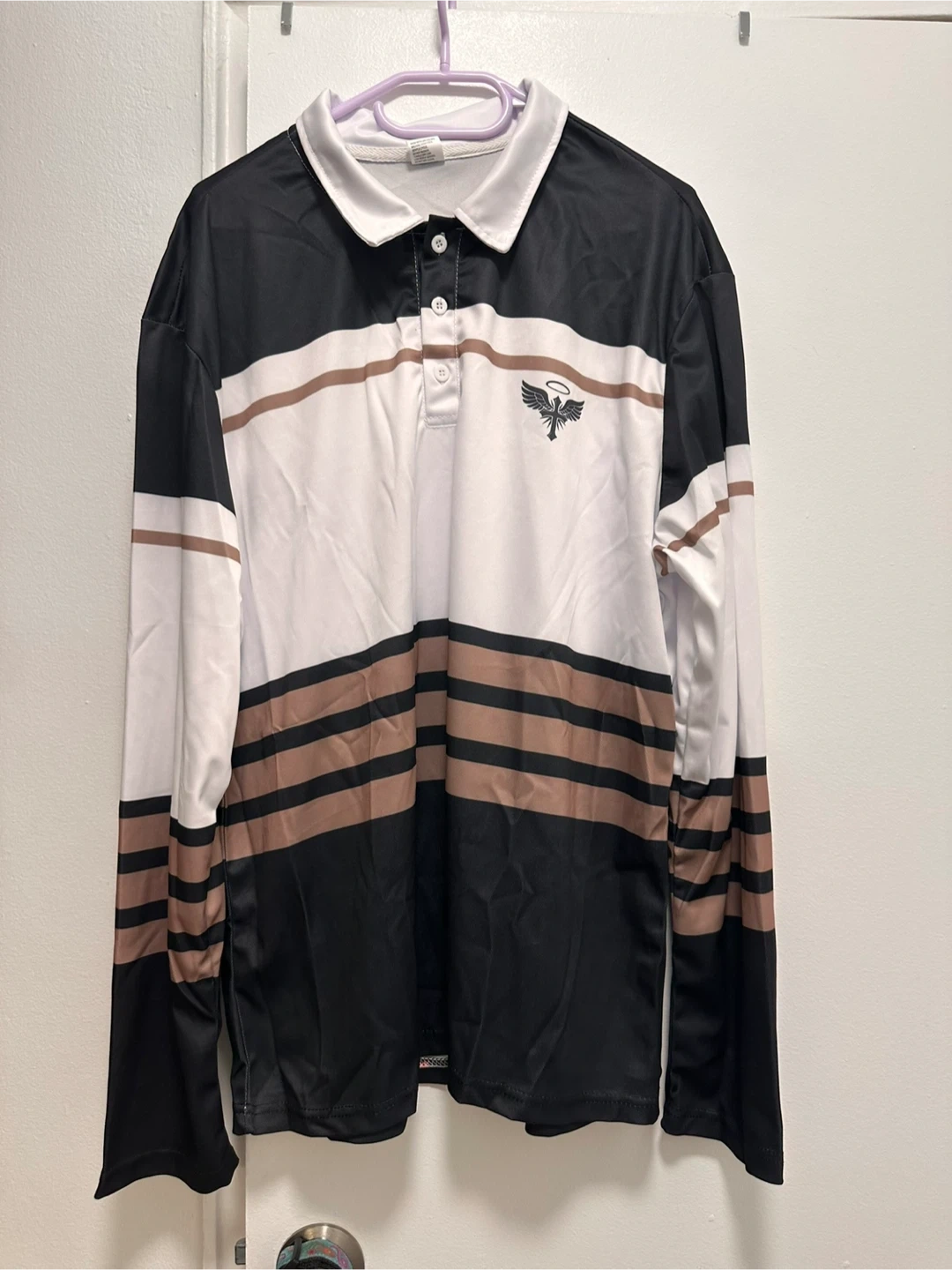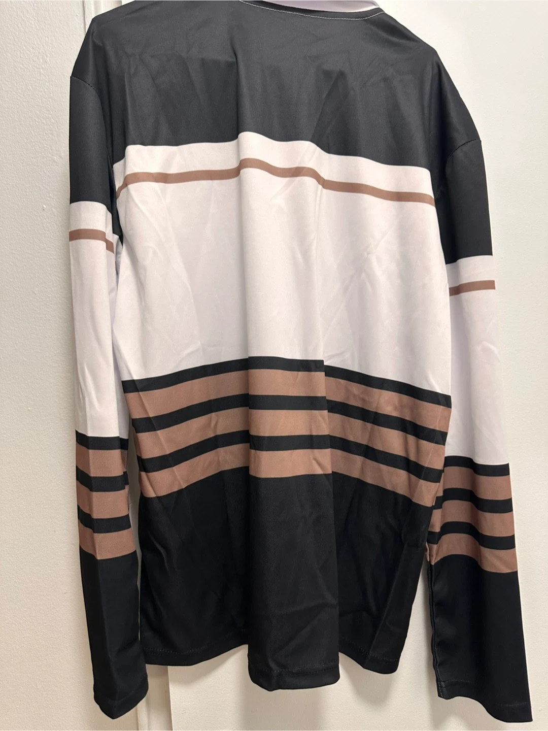 Here's a long sleeve polo shirt with a unique striped design in black, white, and brown. It features a collar and button-up detail, perfect for a casual yet stylish look