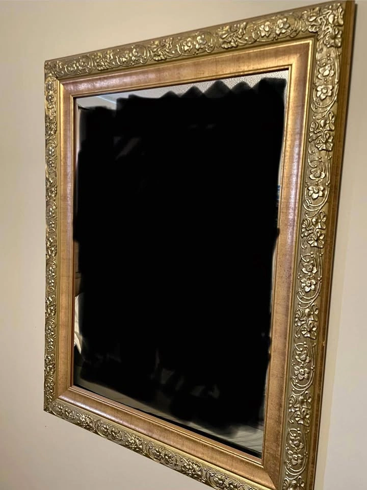 Adorn your space with this vintage-style mirror, featuring an ornate gold-tone frame, perfect for adding a touch of elegance to any room. Gently used, like new.