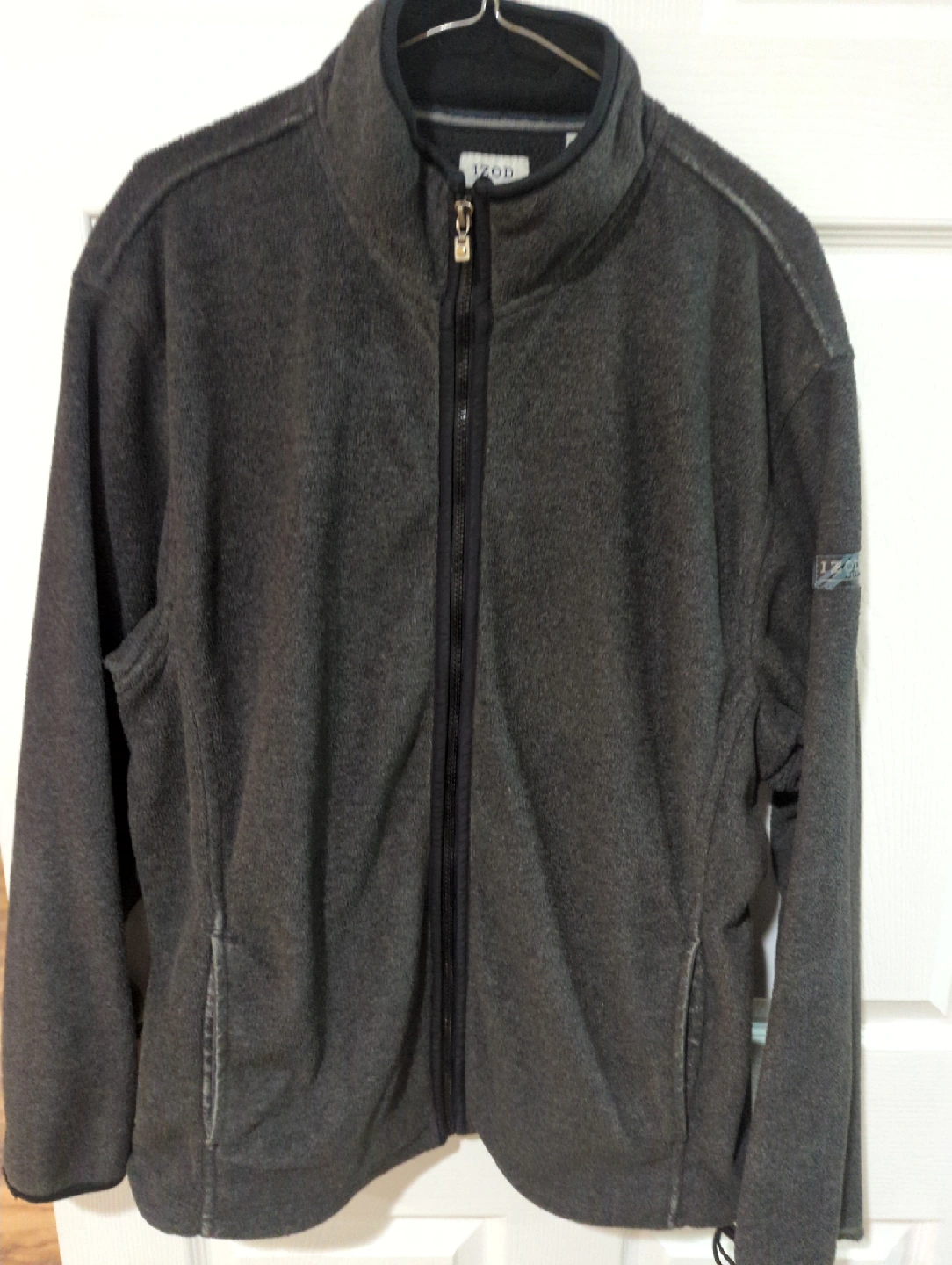 83Cozy IZOD fleece jacket in a nice gray colour! It's in great condition and perfect for layering during the cooler months. Features a full zip and handy pockets