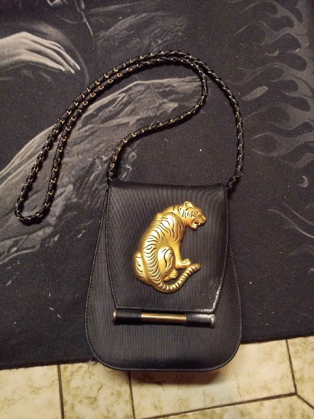10Cute little black shoulder bag with a gold tiger design! It has a chain strap and a unique look. Perfect for adding a bit of flair to your outfit!
